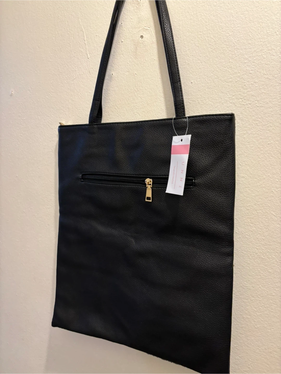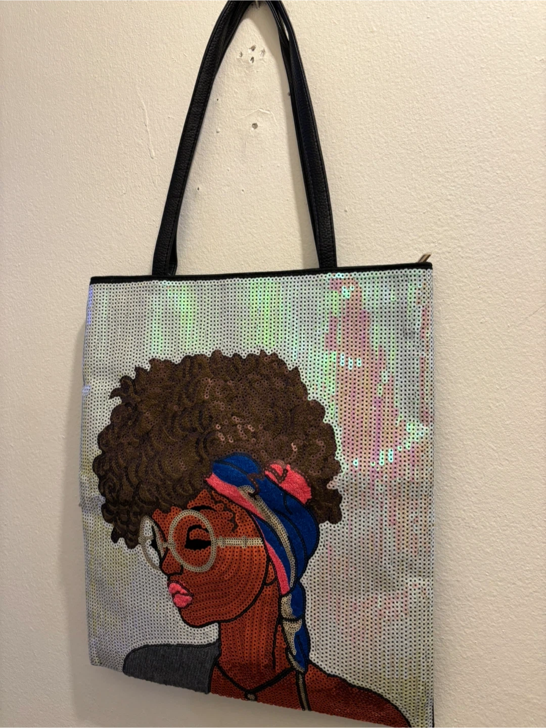This is a fun sequin tote bag! It has a unique design on the front and a black faux leather back with a zipper. Perfect for carrying your essentials in style