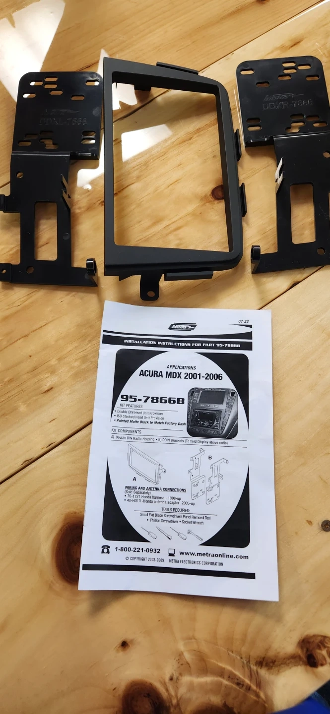 Selling a Metra 95-7866B radio installation kit for Acura MDX models from 2001-2006. This kit allows for replacing the factory radio with an aftermarket unit. It includes the necessary brackets and a panel matte black to match the factory dash. Also included are the installation instructions.