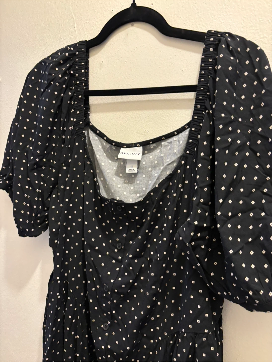Cute black dress from AVA & VIV in size 1X! It has a square neckline and short, puffy sleeves. The dress features a subtle white square pattern throughout. Perfect for a casual day out or dressed up for an evening event