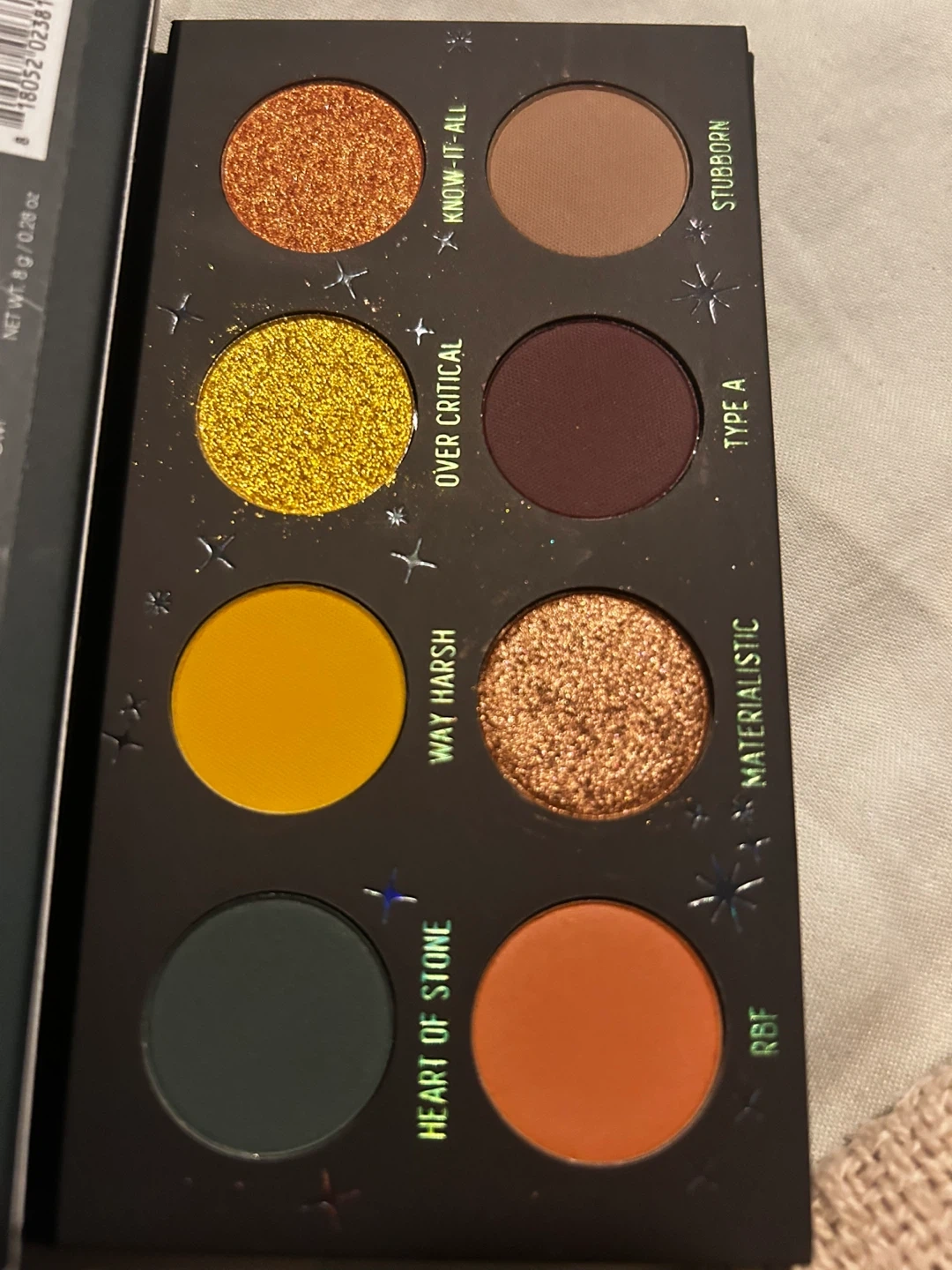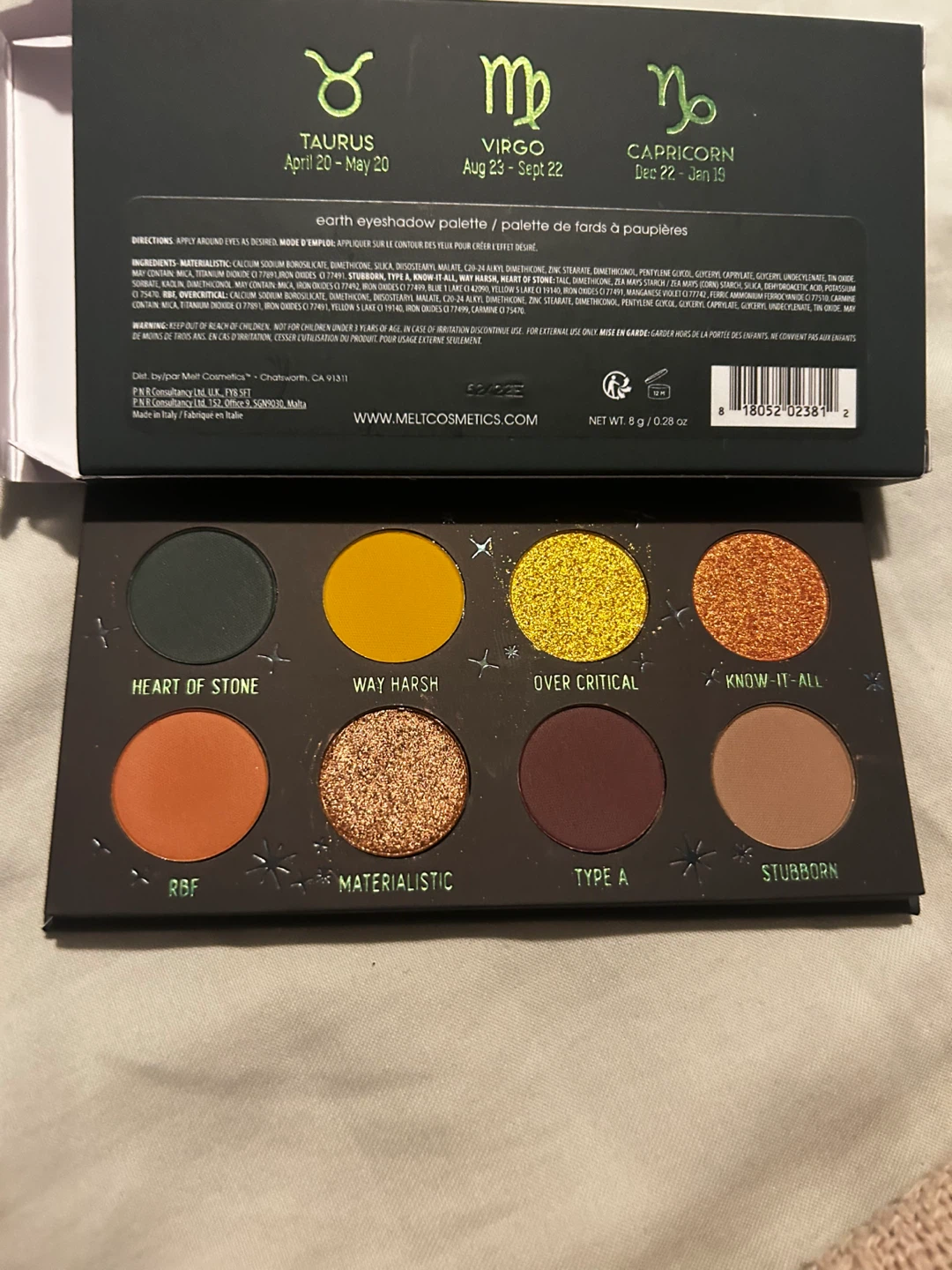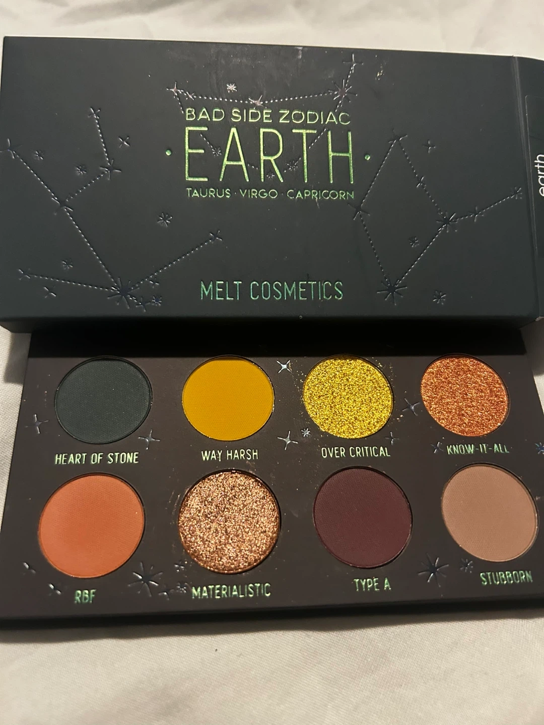 Selling a Melt Cosmetics Bad Side Zodiac Earth eyeshadow palette! It's got some beautiful shades like Heart of Stone, Way Harsh, Over Critical, Know-It-All, Materialistic, Type A, Stubborn, and RBF. Perfect for creating a variety of looks