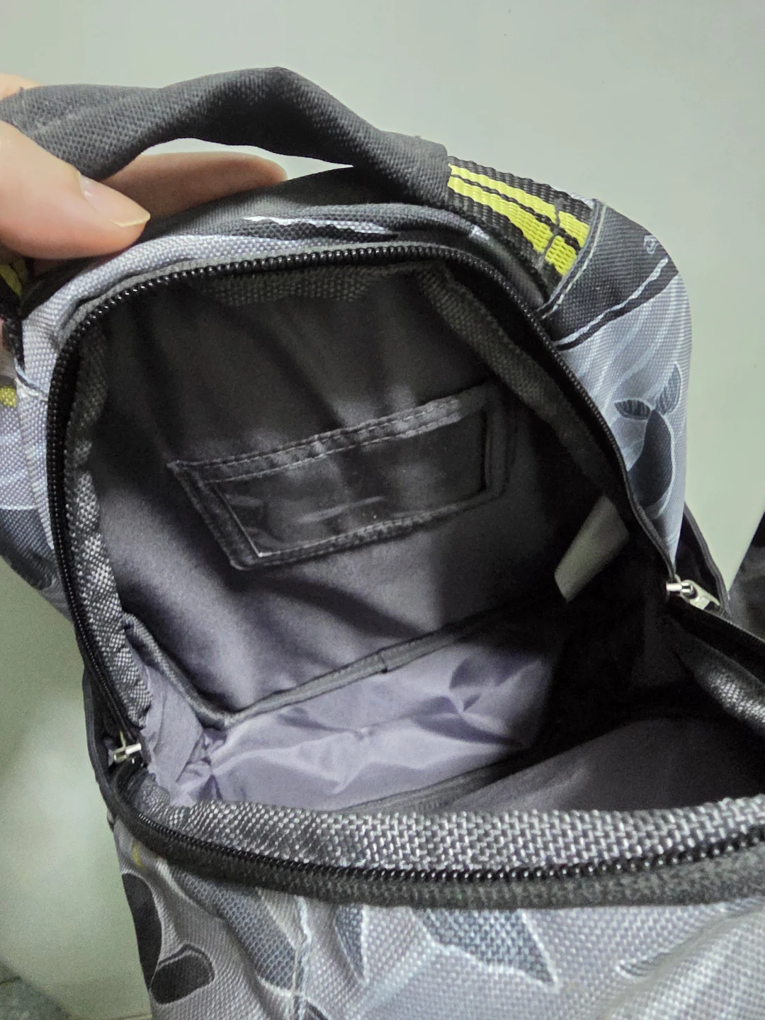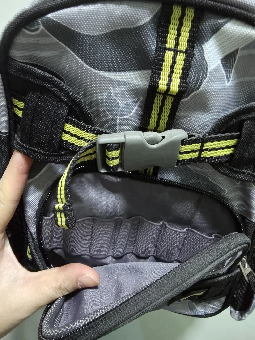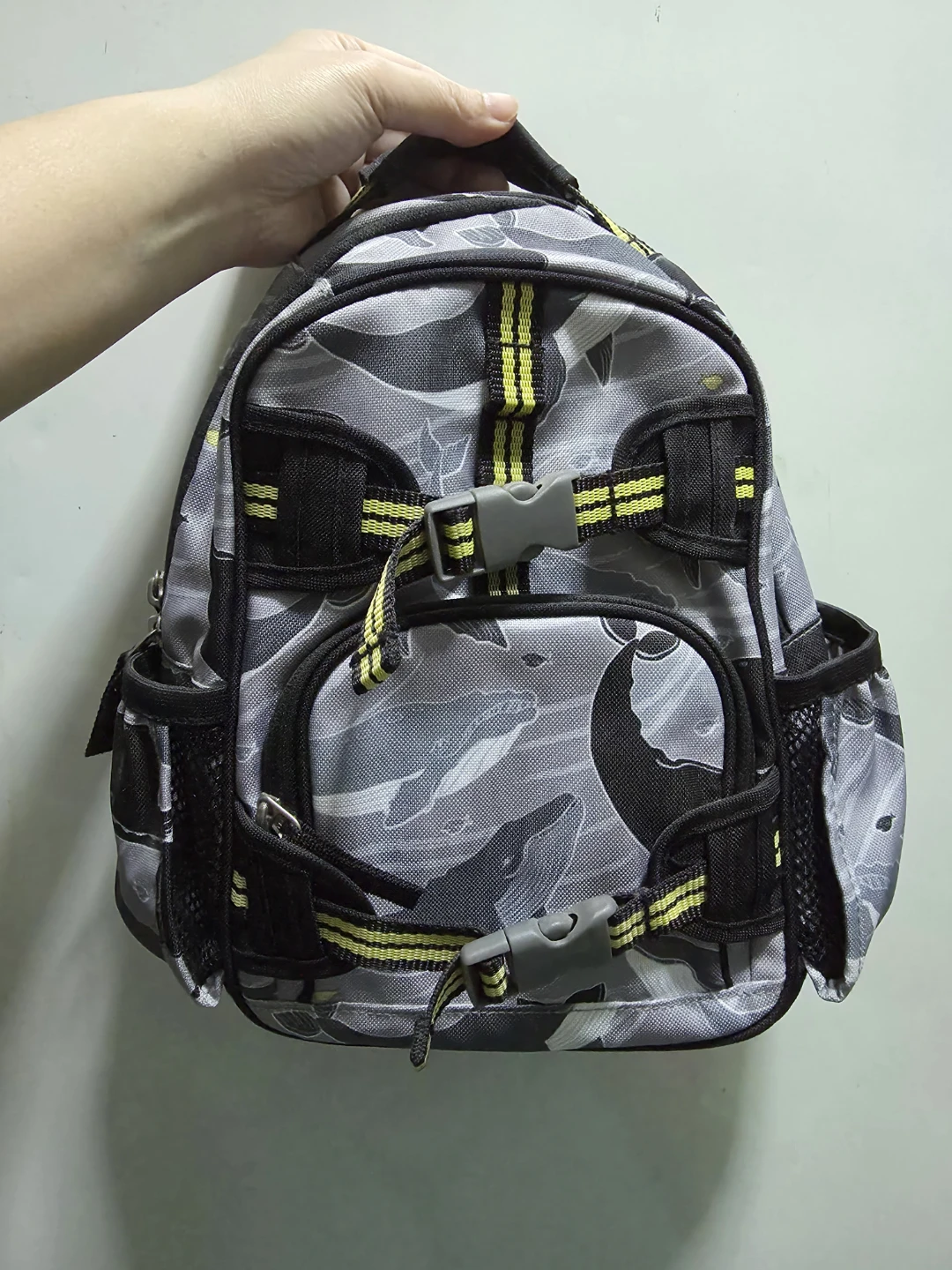 LIKE NEW gray backpack with black and yellow accents for toddler. Whale design. It features multiple compartments and adjustable straps.
