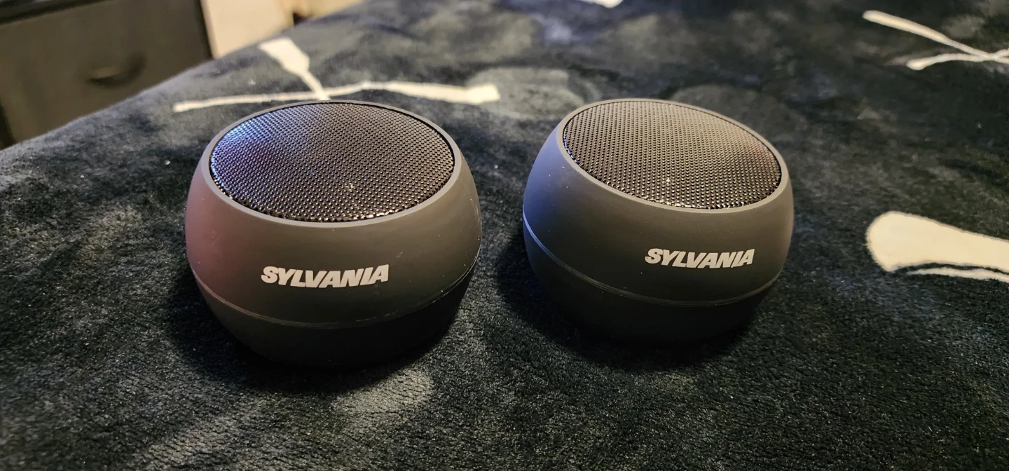 Selling a pair of Sylvania mini Bluetooth speakers. They are black and in great condition. Perfect for on-the-go listening!