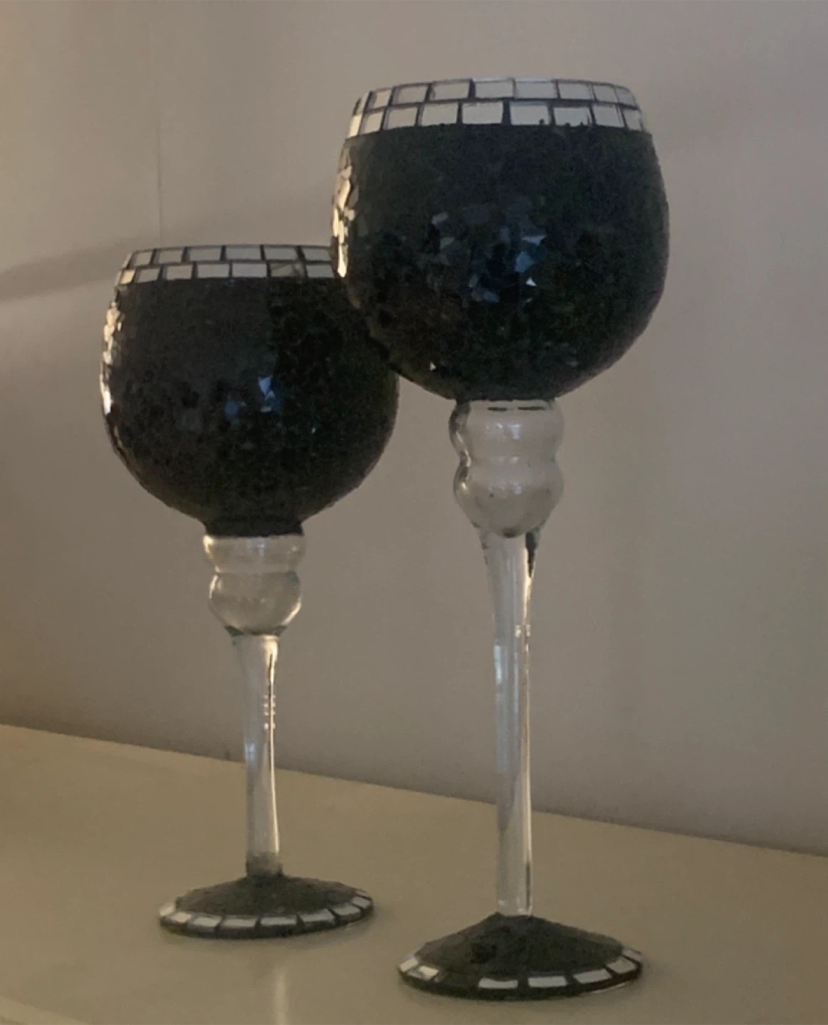 Selling a set of two mosaic candle holders. They have a black mosaic design on the top and base with clear glass stems. Perfect for adding a touch of elegance to any room!