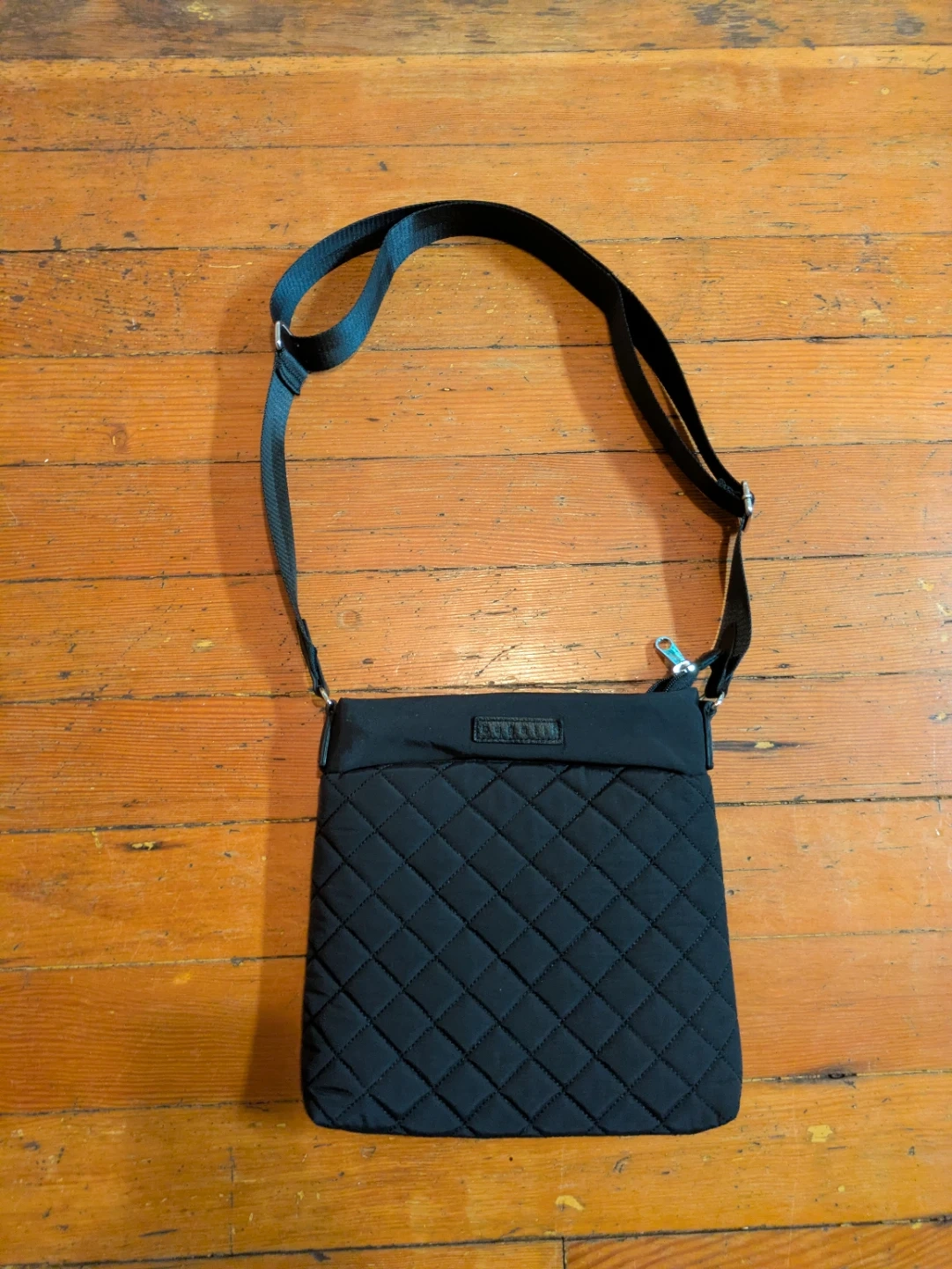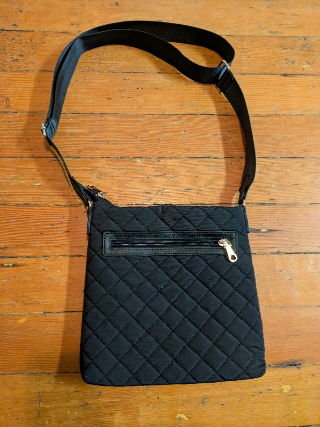 Selling a Bugatti crossbody bag in black! It has a quilted pattern and is perfect for carrying essentials. Secret magnetic front pocket. Zippered back pock and deep inside with smaller pocket