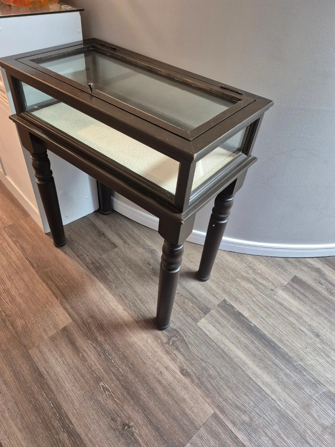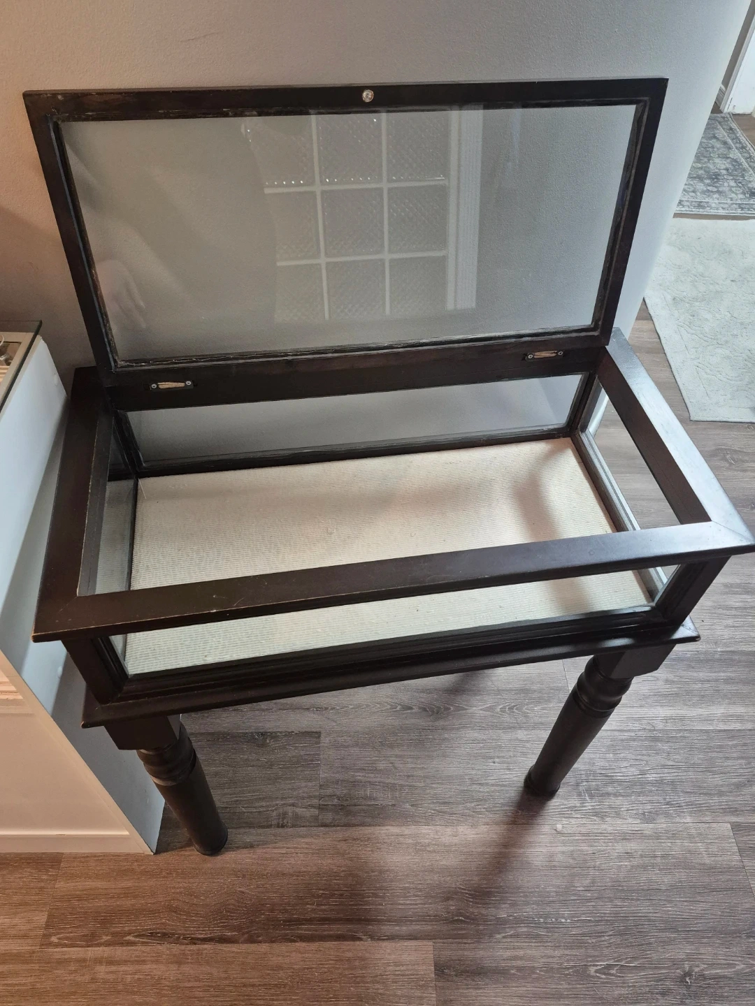 Elegant solid wood glass display table featuring a rich dark wood finish and classic turned legs. Designed with a glass top lift-up lid and glass sides, making it perfect for displaying collectibles, décor, jewelry, or retail products while keeping them protected.