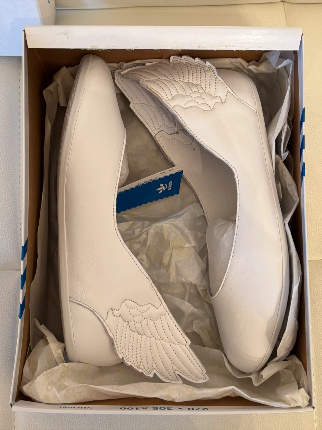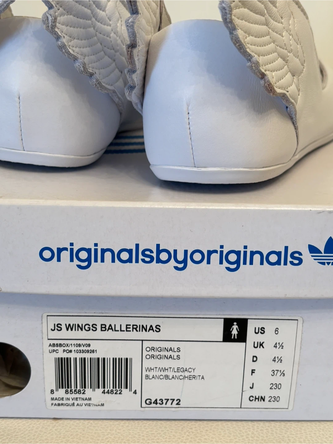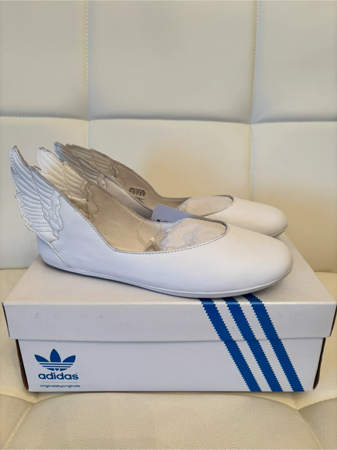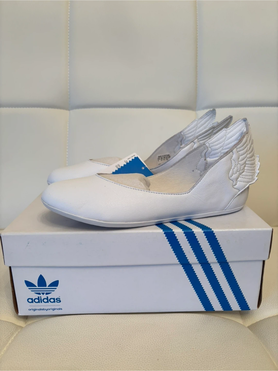 Selling a pair of Adidas JS Wings Ballerinas from 2011 collection in size 6, could fit 6.5 US. They are white and come with the original box! These unique ballerinas have a fun wing design on the back. They are in brand new condition and ready for a new owner.