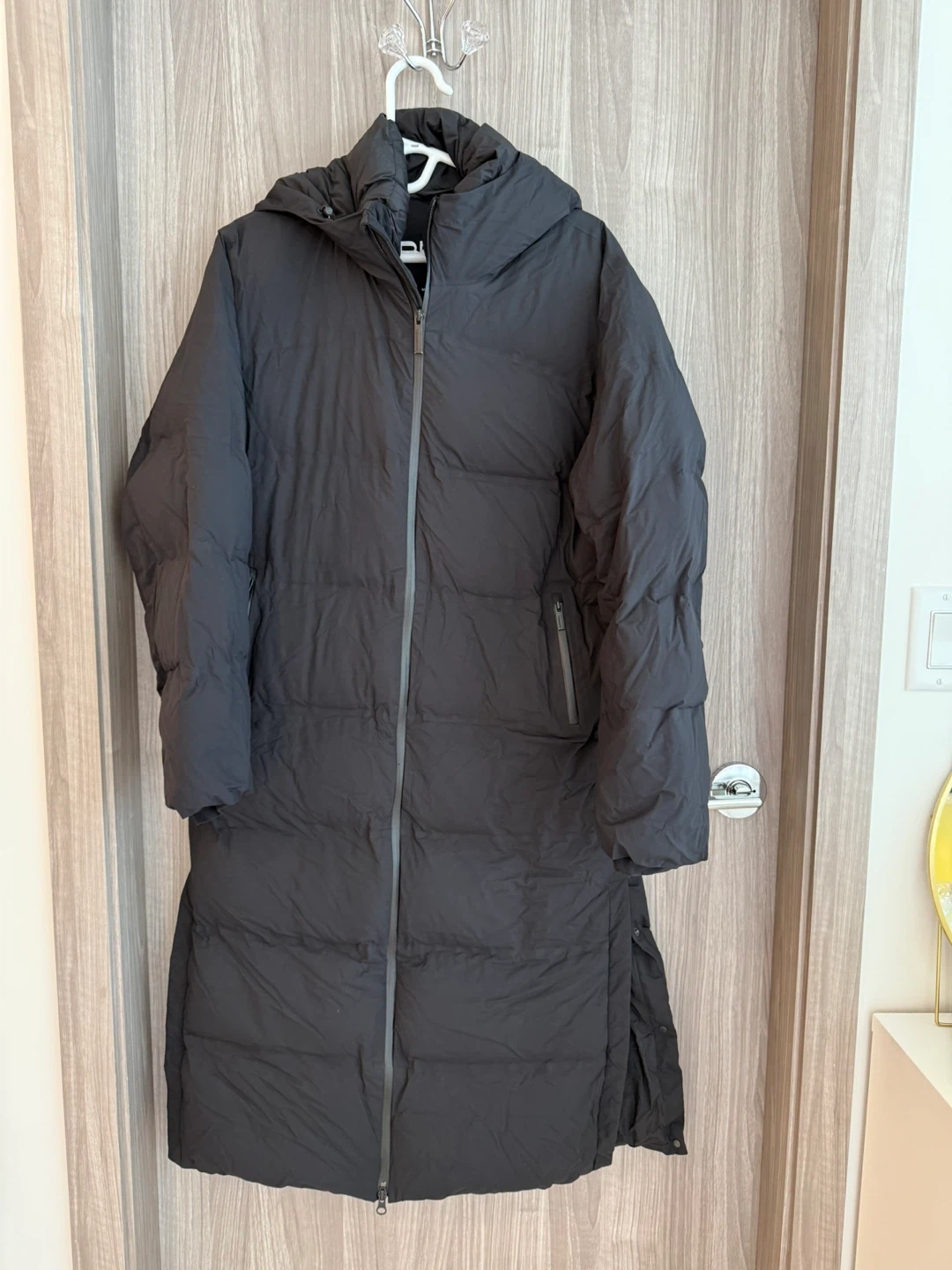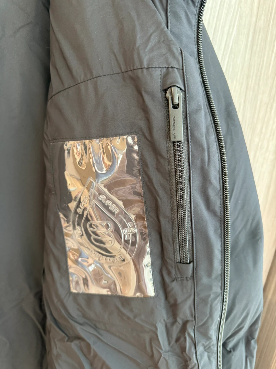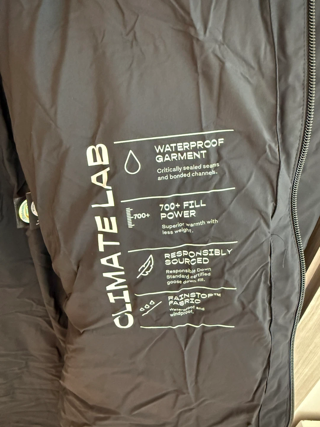 Selling a Climate Lab Powder Puff down coat in size medium. It's a waterproof garment with critically sealed seams and bonded channels. This coat has 700+ fill power, offering superior warmth with less weight. The fabric is Rainstop, making it waterproof and windproof