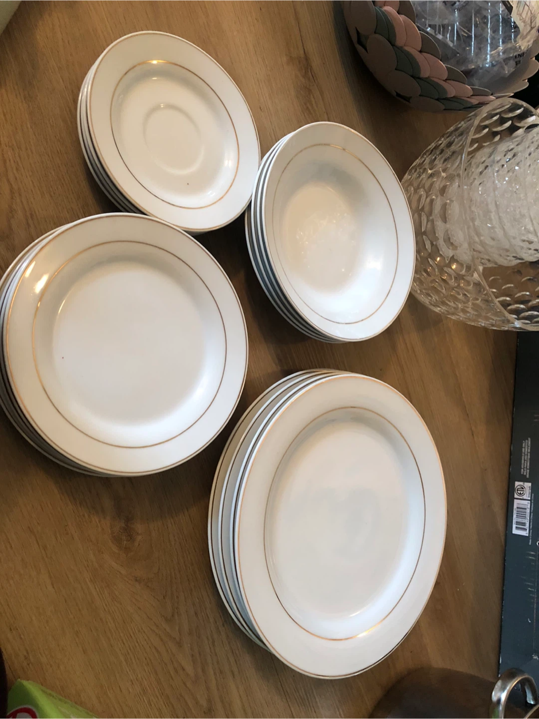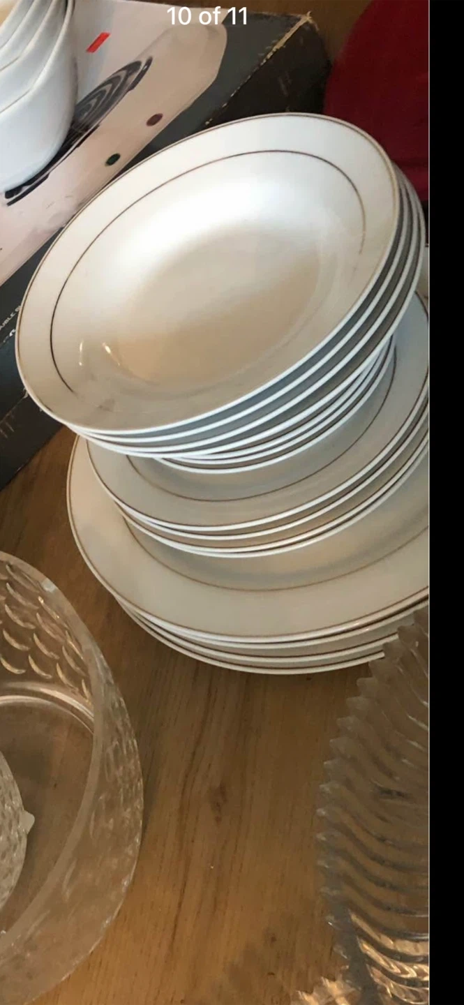 Selling a set of white plates with a gold trim. They are in great condition and would look lovely on any table. Perfect for everyday use or special occasions!