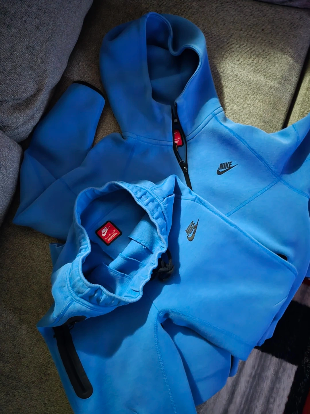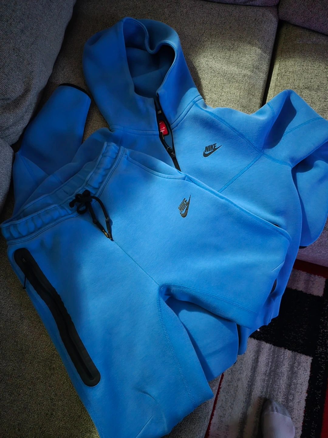 Selling a Nike Tech Fleece set in a nice blue colour! It includes both the hoodie and the pants, both in size small. Great for lounging or working out!
