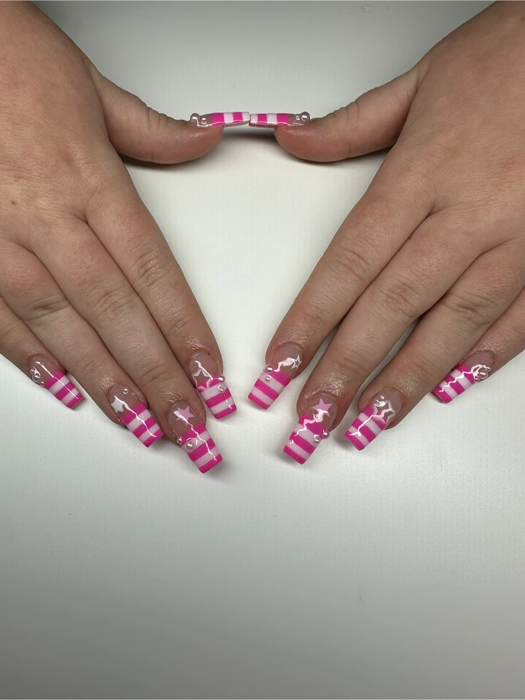 esthetician student looking for practice. pricing includes everything, length, design, charms. sets last 3+ weeks i do gel x or poly gel. home based. thelashleystudio on ig! deposit is 10 for your spot.