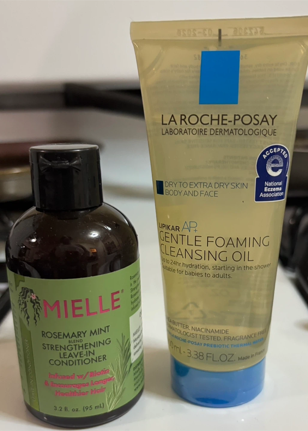 I'm selling a La Roche-Posay Lipikar AP+ Gentle Foaming Cleansing Oil for dry to extra dry skin on the body and face. It provides up to 24hr hydration and is suitable for babies to adults. Also included is a Mielle Rosemary Mint Strengthening Leave-In Conditioner infused with Biotin to encourage longer, healthier hair. The conditioner contains 3.2 fl oz (95 mL)