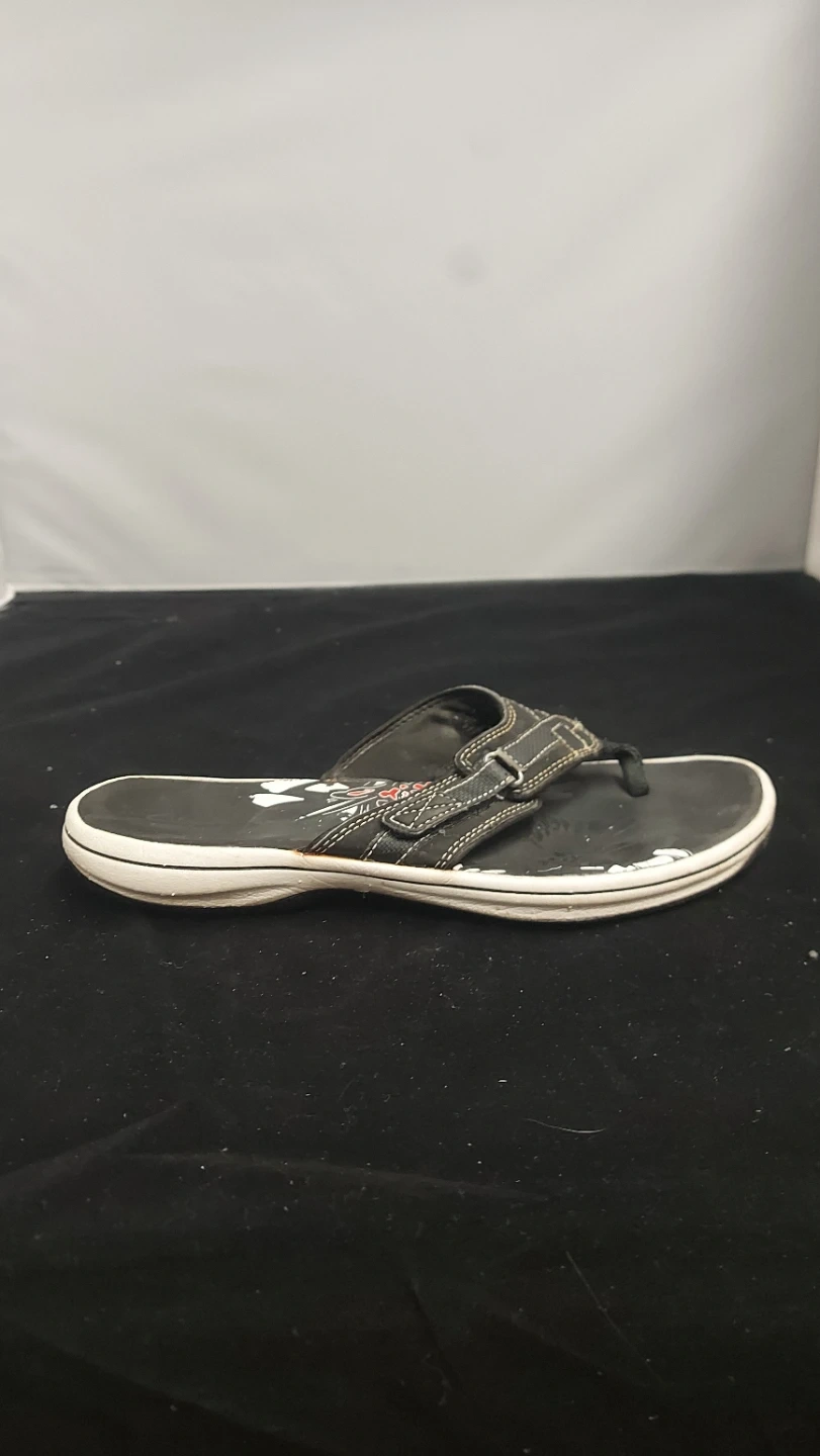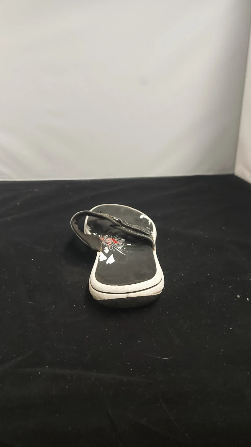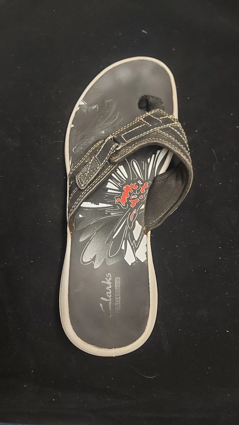These are a pair of women's Clarks flip flops in black. 33 pre owned & open to negotiate. They have a flower design on the footbed and an adjustable strap. Show a little signs of wear but are still in good condition for casual use.