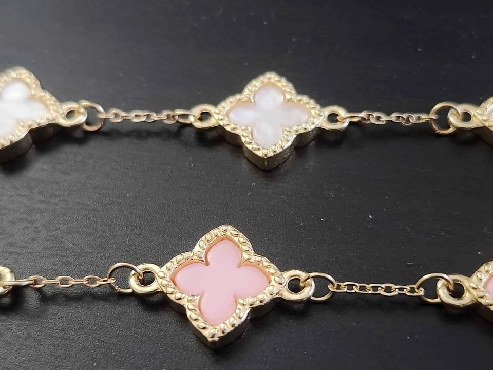 Beautiful gold-tone clover charm bracelets available in soft pink and classic white.