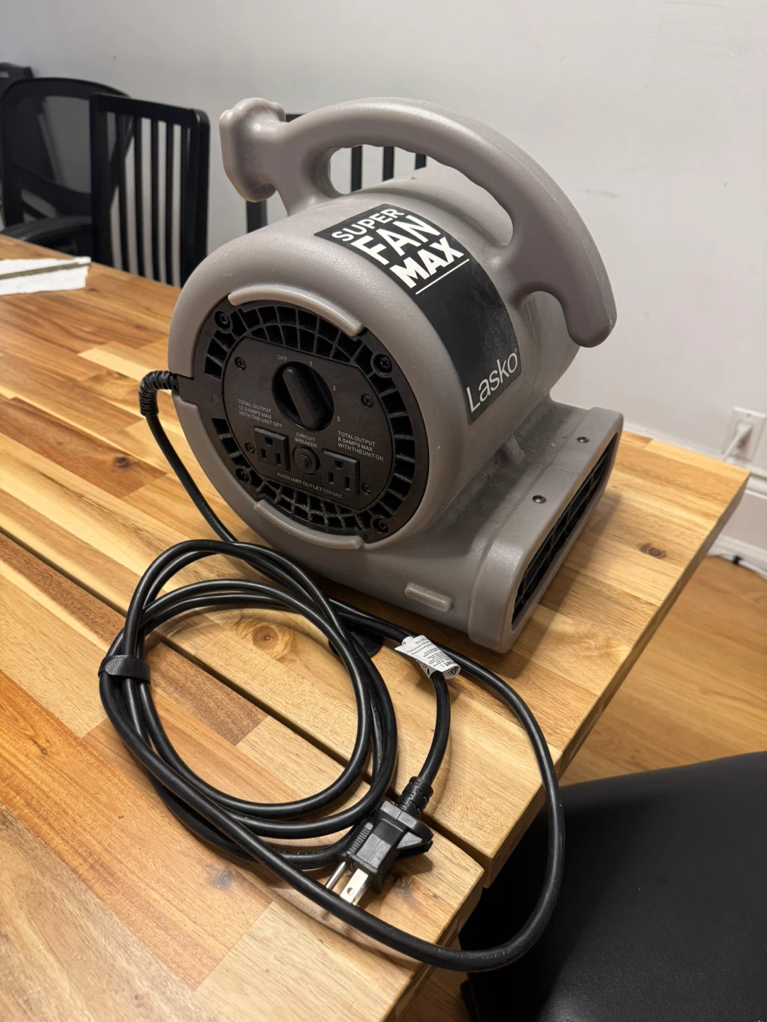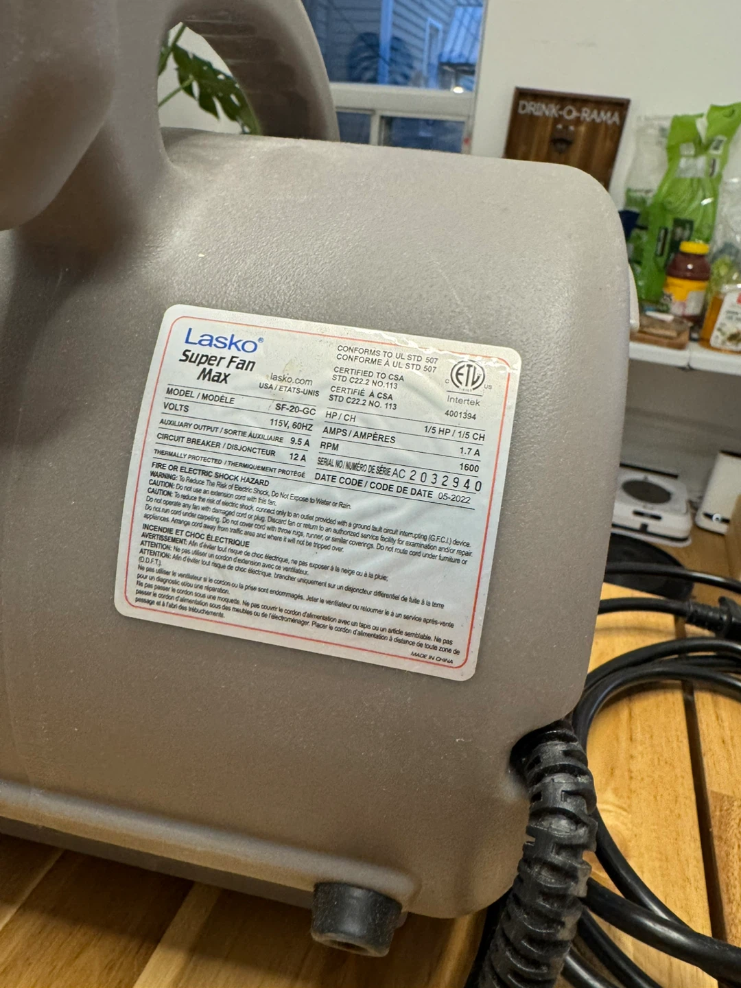 Selling a Lasko Super Fan Max, model SF-20-GC. It has a 1.2A auxiliary outlet and a circuit breaker for safety. Very powerful fan/air mover