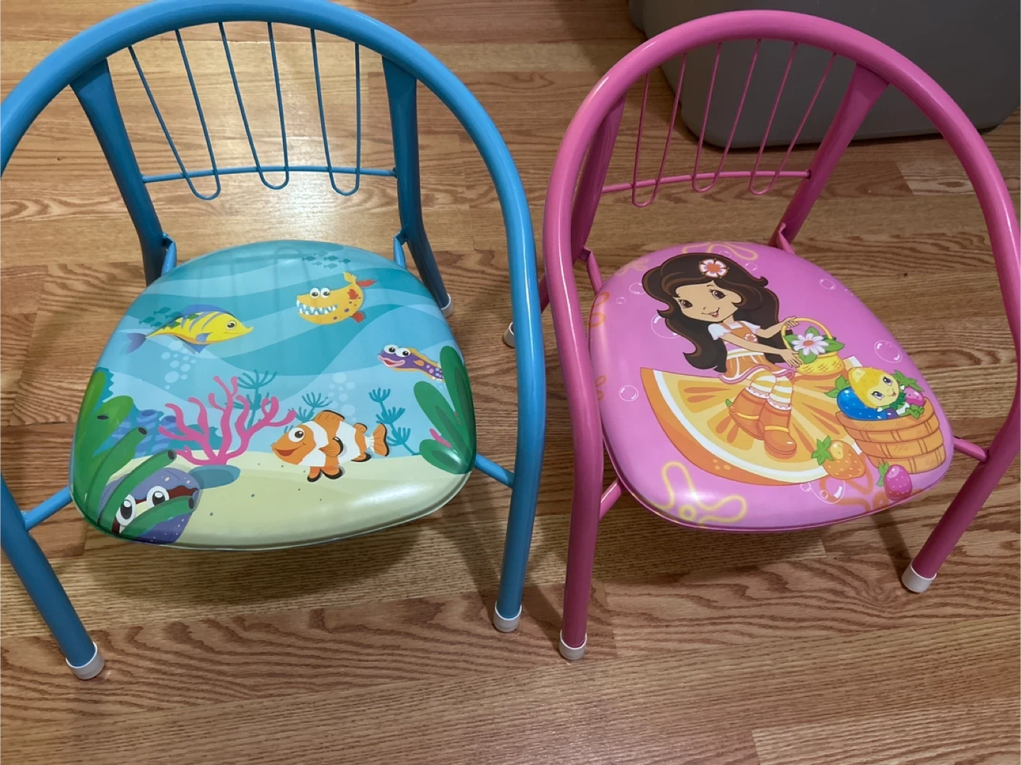 Two adorable kids' chairs up for grabs! One is blue with a cute fish design, and the other is pink featuring Strawberry Shortcake. They're perfect for adding a pop of fun to any child's room or play area