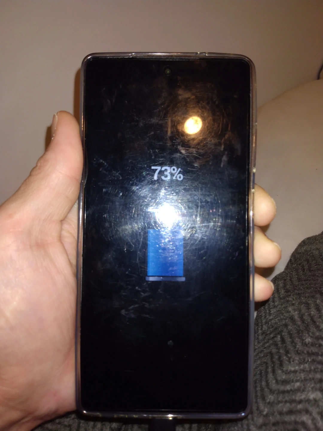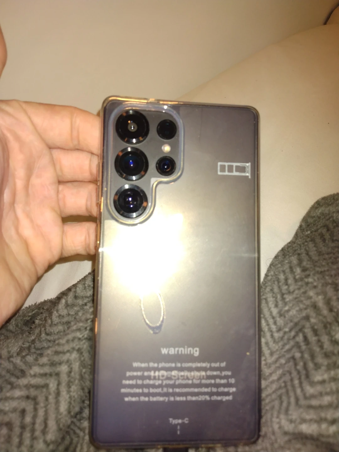 Selling a used Samsung S25 phone. It has a clear case on it. The phone is charging in the photo.