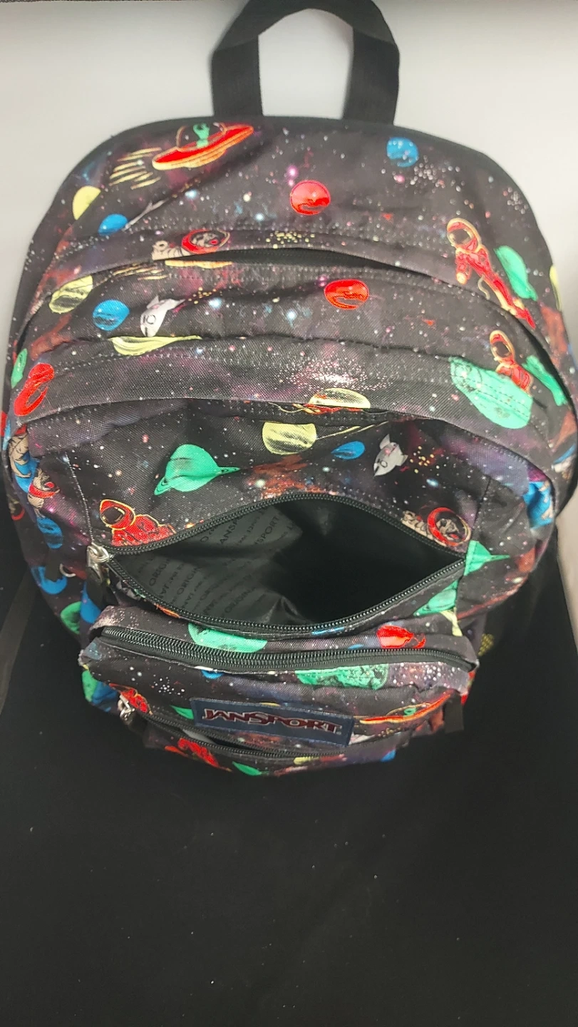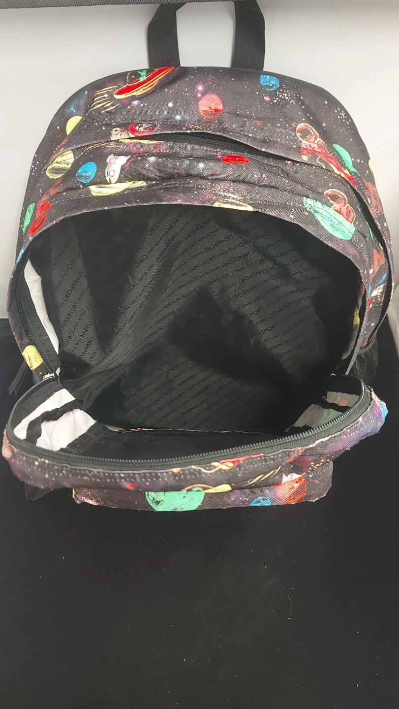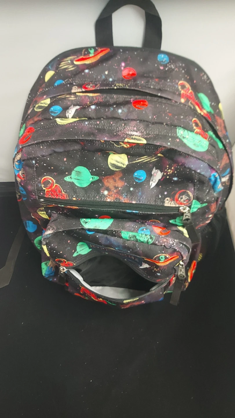 Here's a JanSport backpack featuring a fun space pattern with planets, astronauts, and spaceships! It's in great shape and ready for school or adventures around town