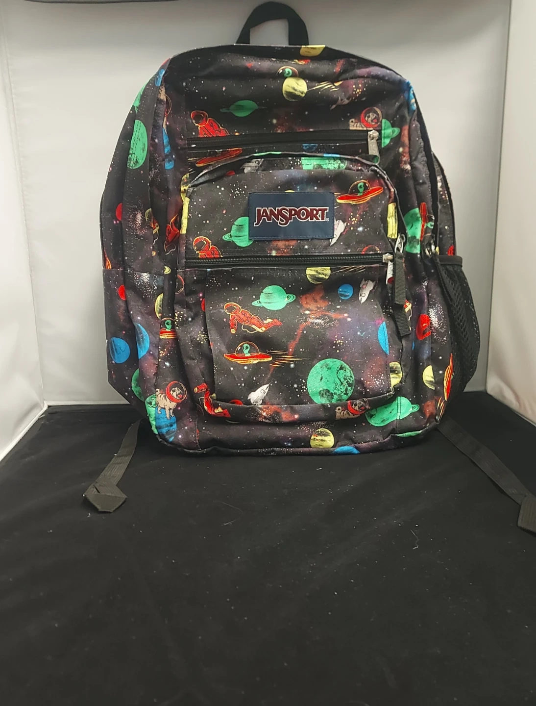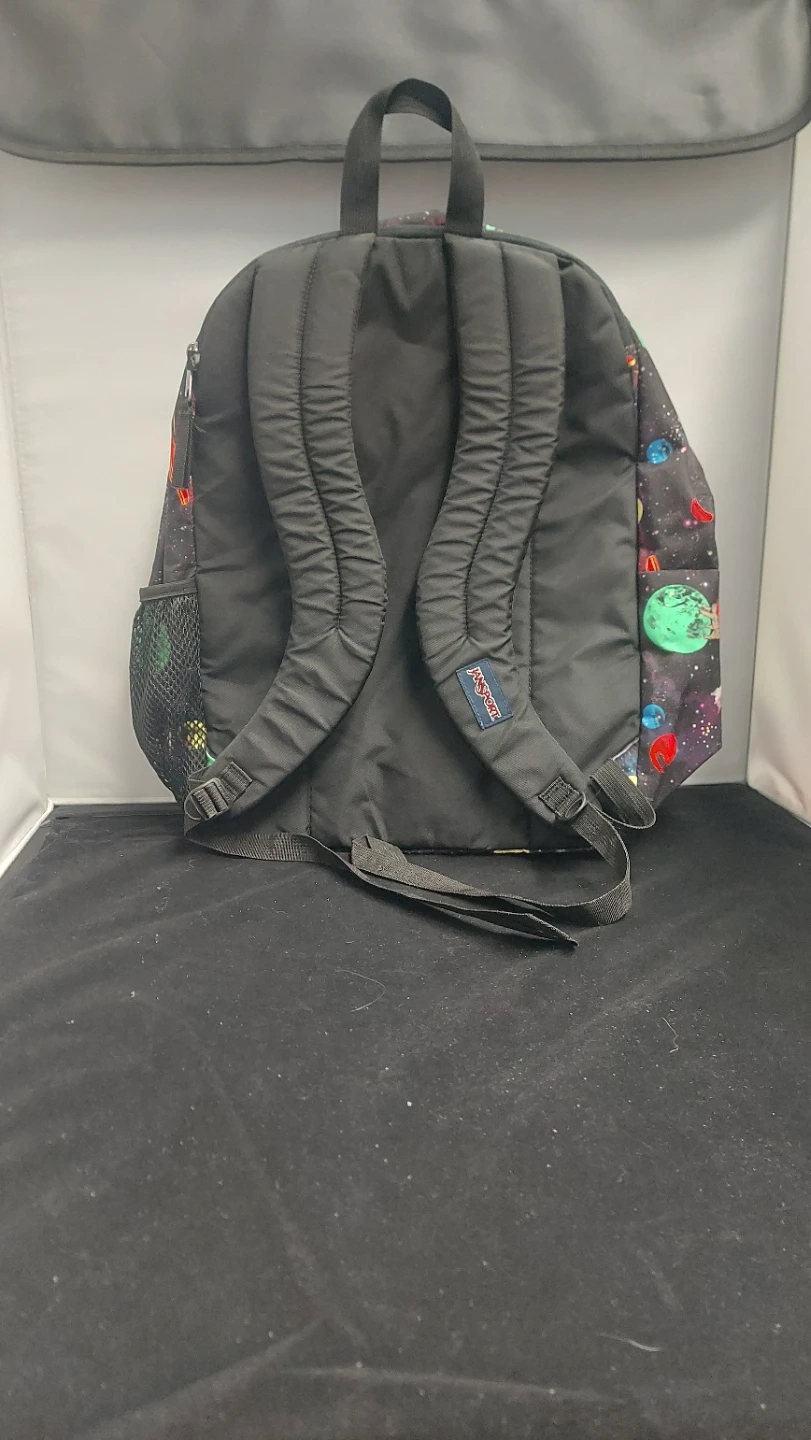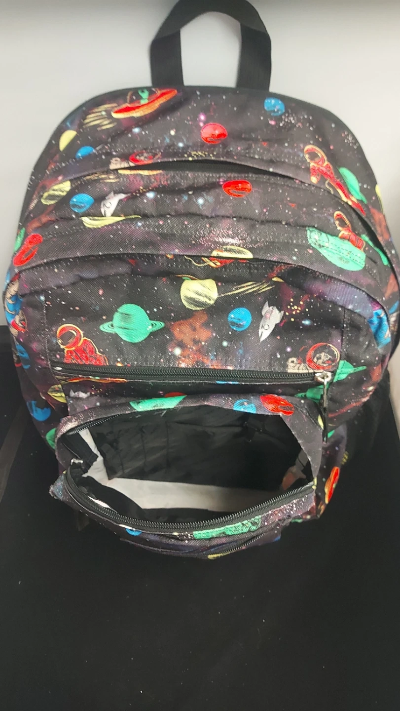 Here's a JanSport backpack featuring a fun space pattern with planets, astronauts, and spaceships! It's in great shape and ready for school or adventures around town