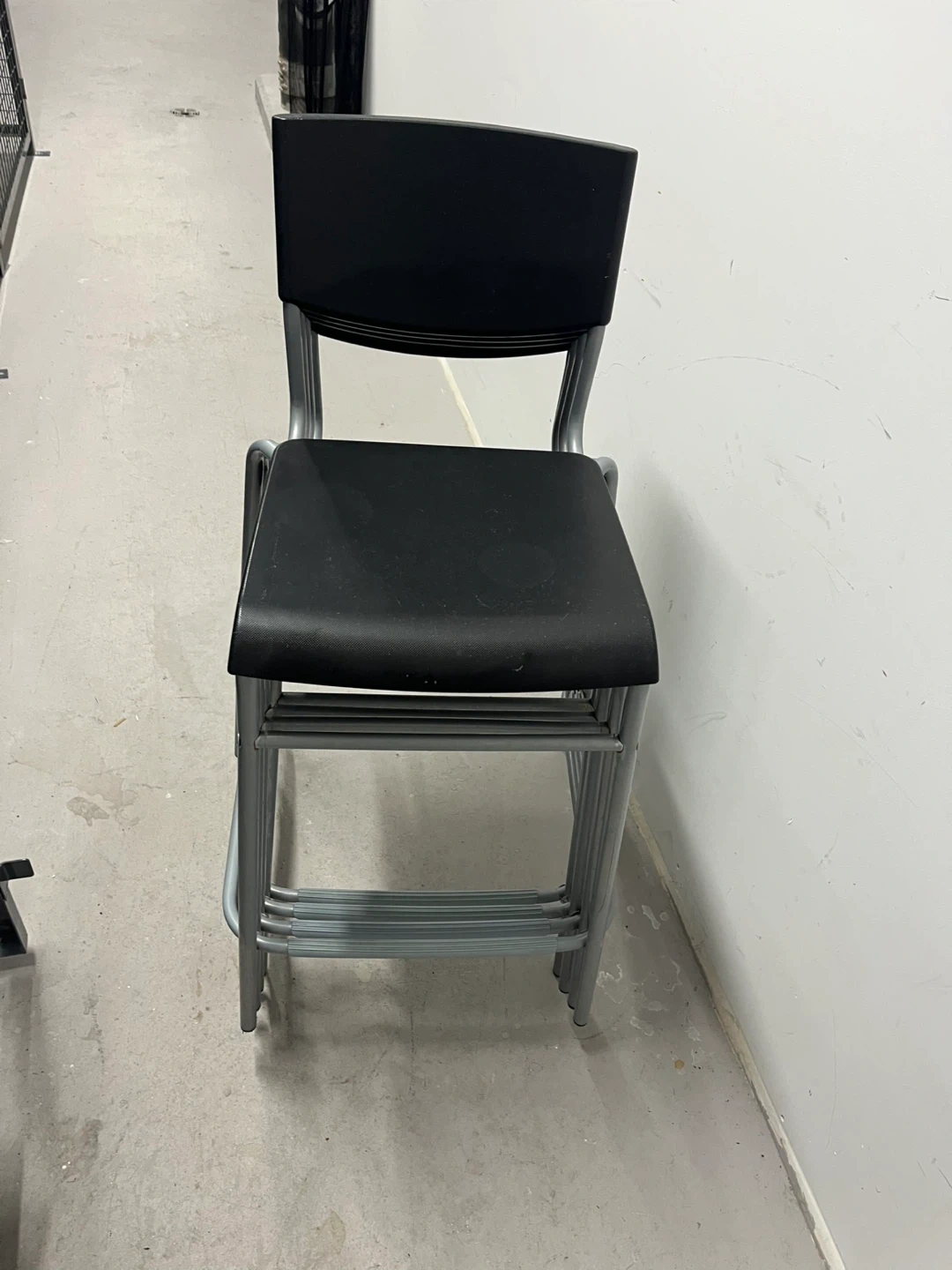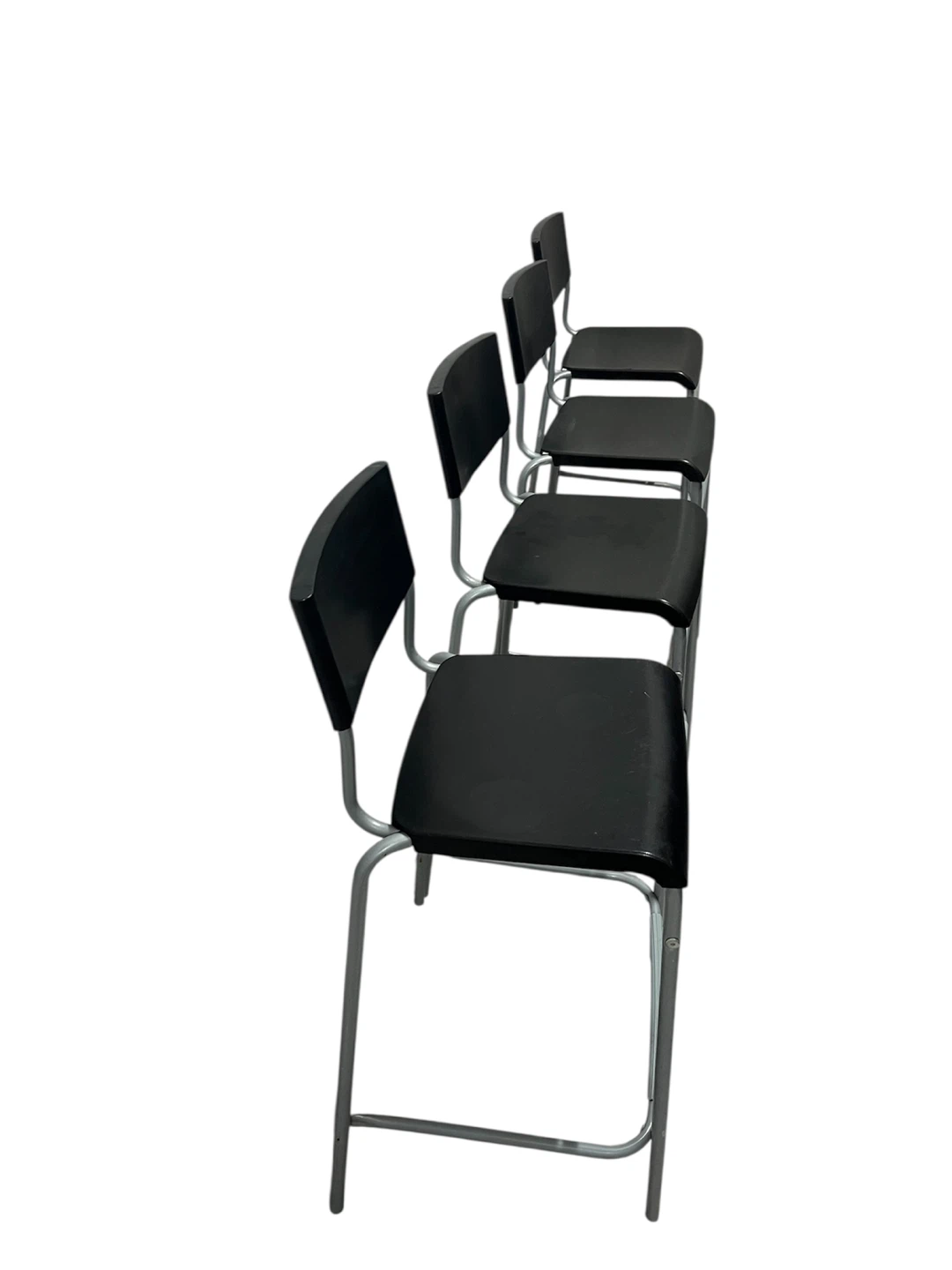 Selling a set of stackable office chairs! They feature a black seat and back with a silver metal frame. Perfect for extra seating in an office or home setting. Set of 4 black stackable office chairs.