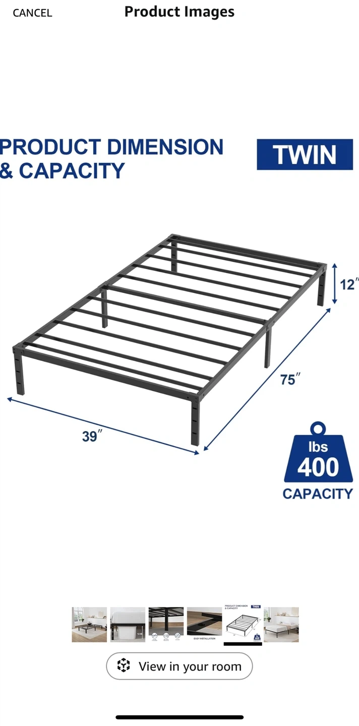 Selling a twin-size metal bed frame in black. It's in great condition, i bought it for my sister but she didn’t like it so its brand new, haven’t used. It's easy to install and can hold up to 400 lbs. The dimensions are 75" x 39" and it stands 12" tall