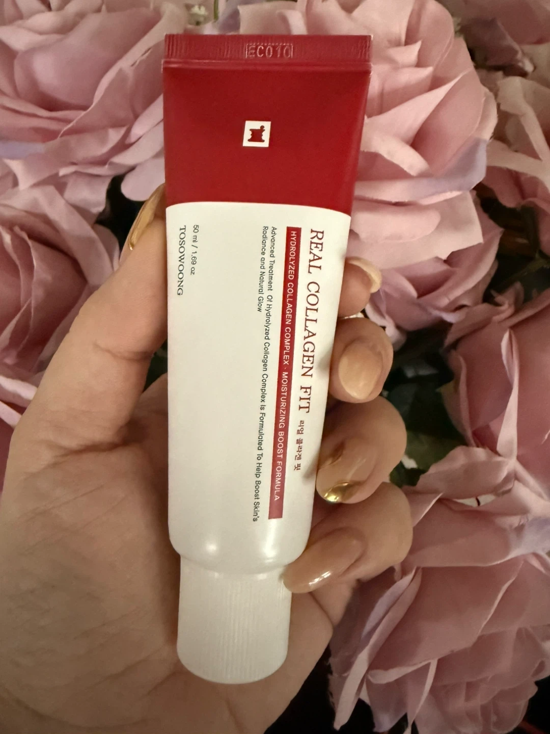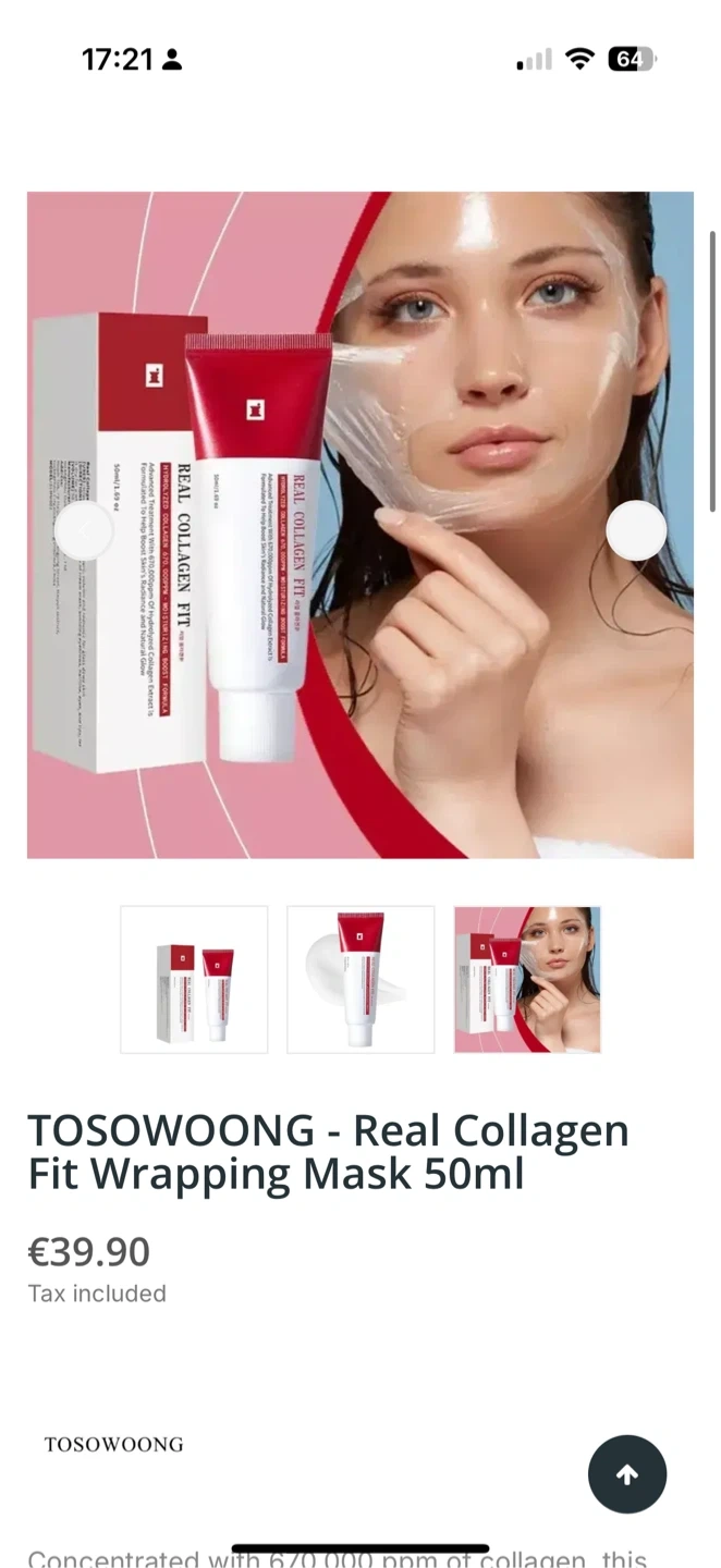 Selling a tube of Tosowoong Real Collagen Fit wrap mask. It's a hydrolyzed collagen complex with a moisturizing boost formula.