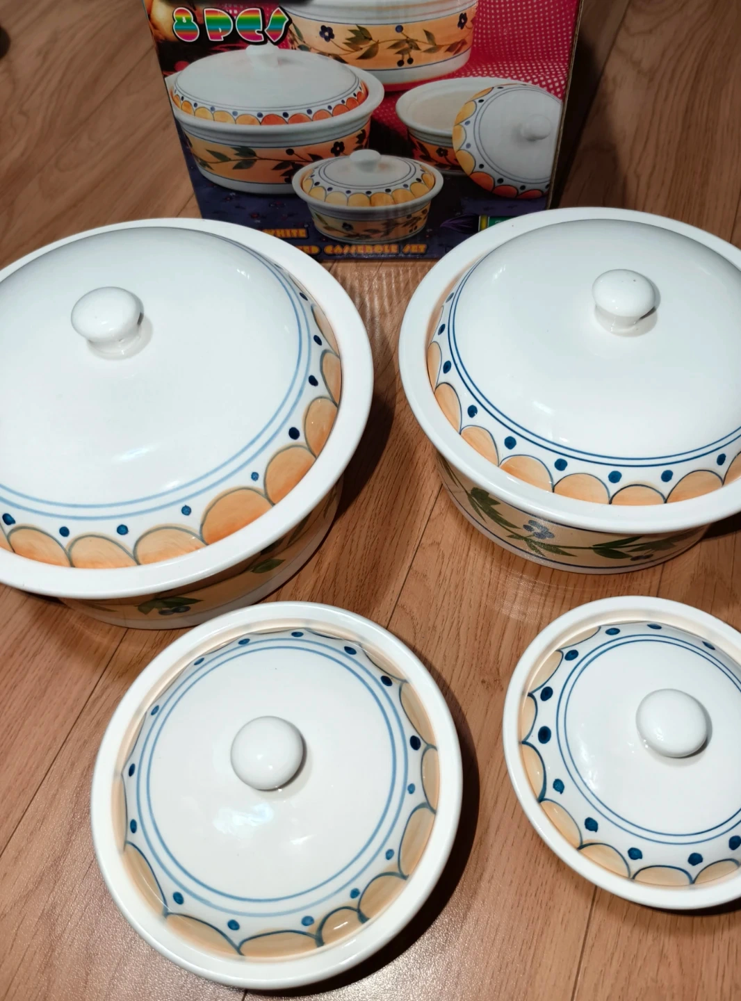 Selling a Migo Housewares 8-piece casserole set! The set is super white and hand-painted with a lovely floral design. Comes with the original box, brand new never use, just took out for photos