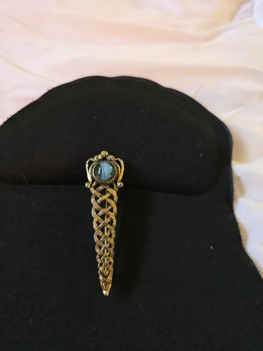 Selling a beautiful vintage brooch featuring a Celtic knot design with a striking blue stone. It's in great condition and would make a lovely addition to any collection or outfit! The gold tone adds a touch of elegance