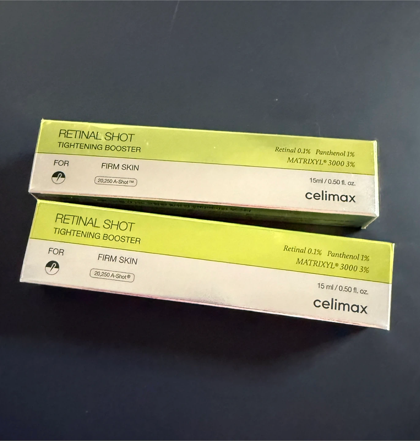 I have two Celimax Retinal Shot Tightening Boosters. They are for firm skin and contain Retinal 0.1% and Panthenol 1%. Each tube is 15ml / 0.50 fl oz. Expiration date is 2027 October 07