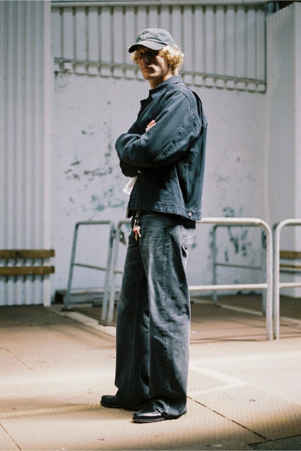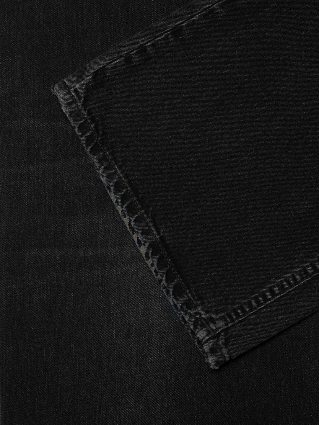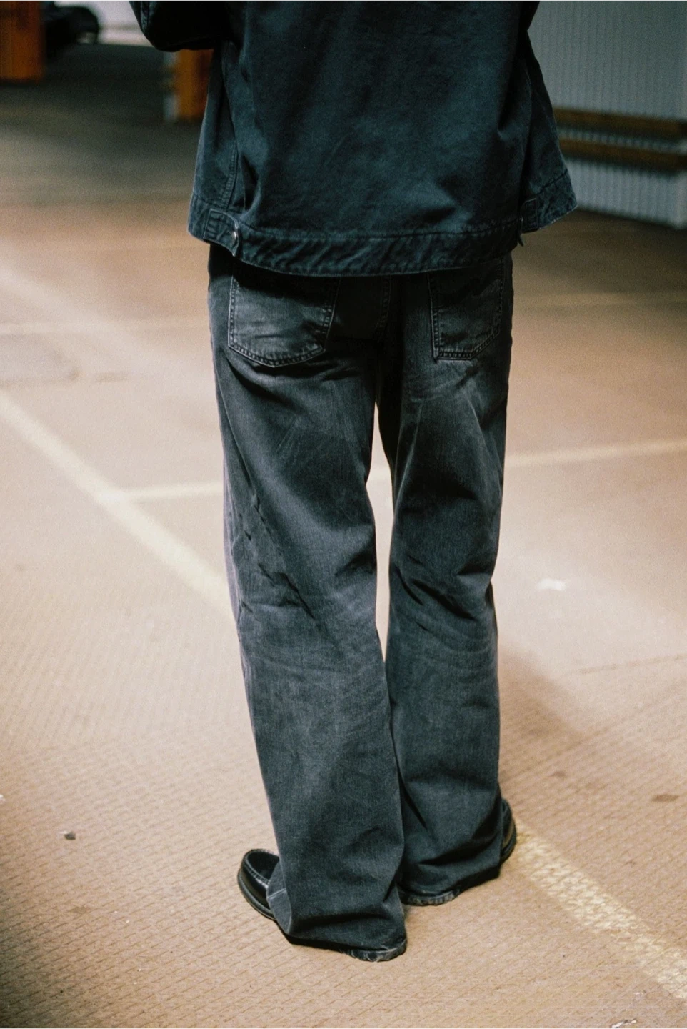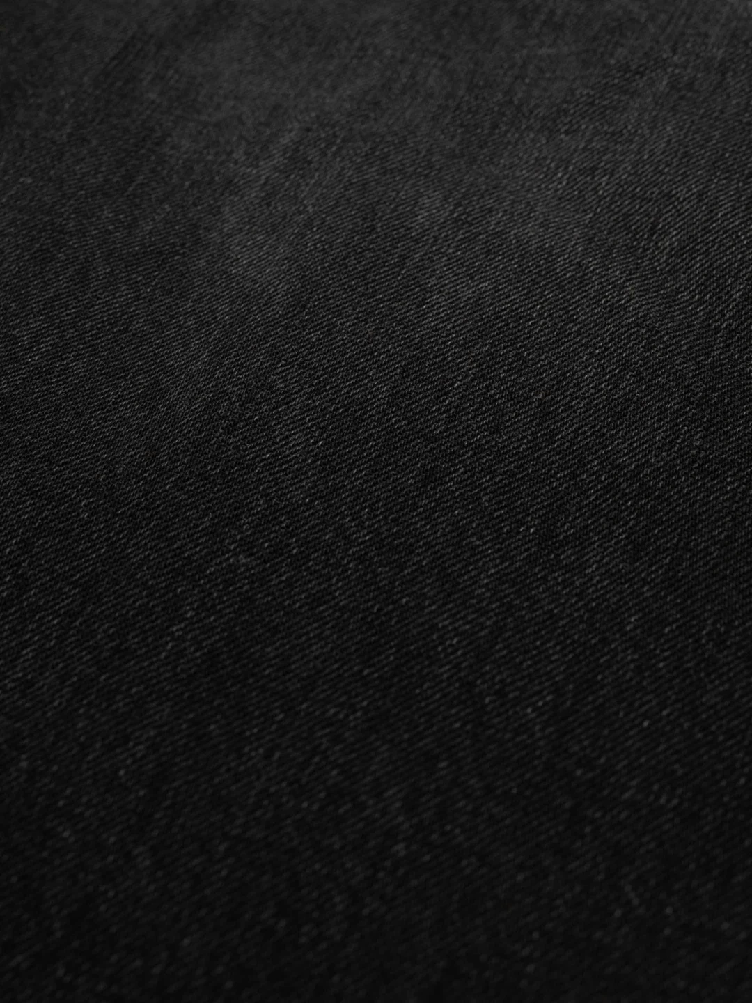 Crafted from exceptional black-overdyed-black denim with pronounced slubbiness, the fabric reveals a striking salt-and-pepper grain and a subtle crosshatch texture.