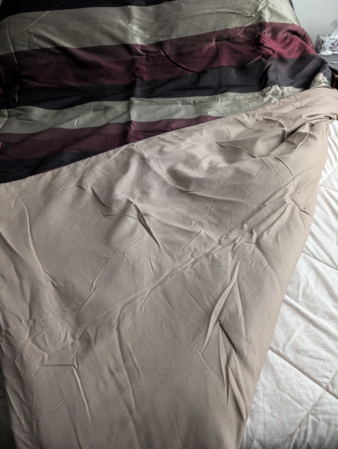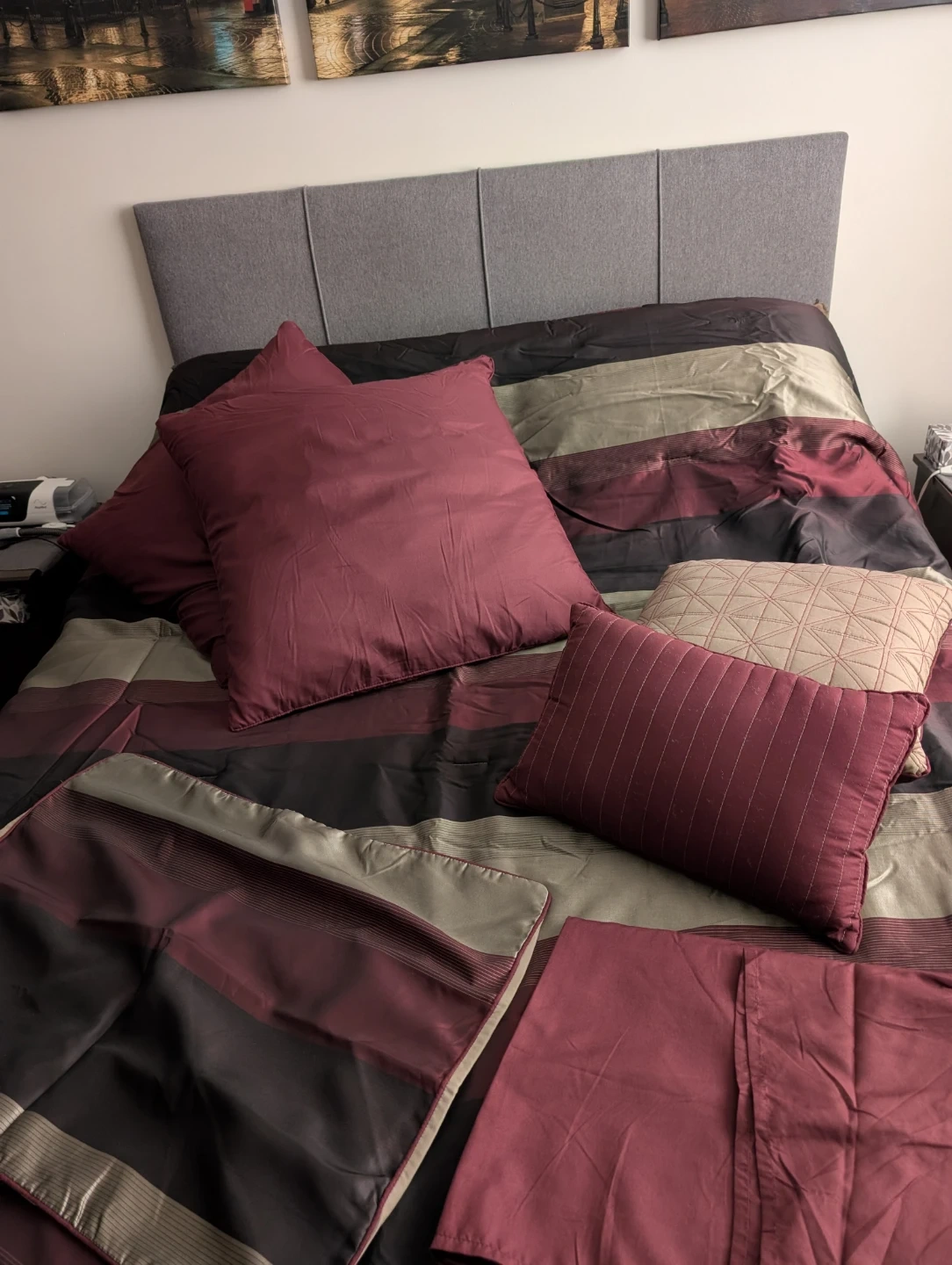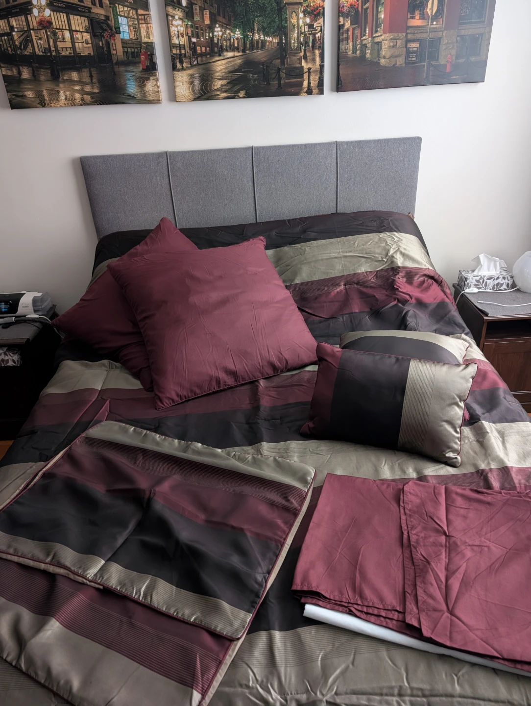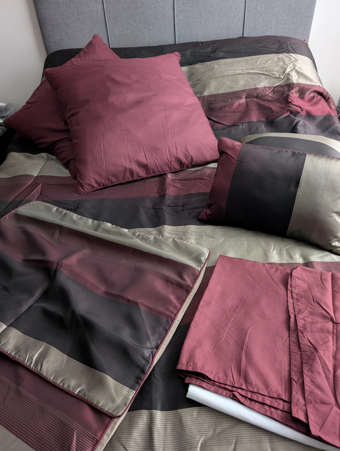 Queen size bedding 8 pieces set in a mix of burgundy, beige, and brown tones.