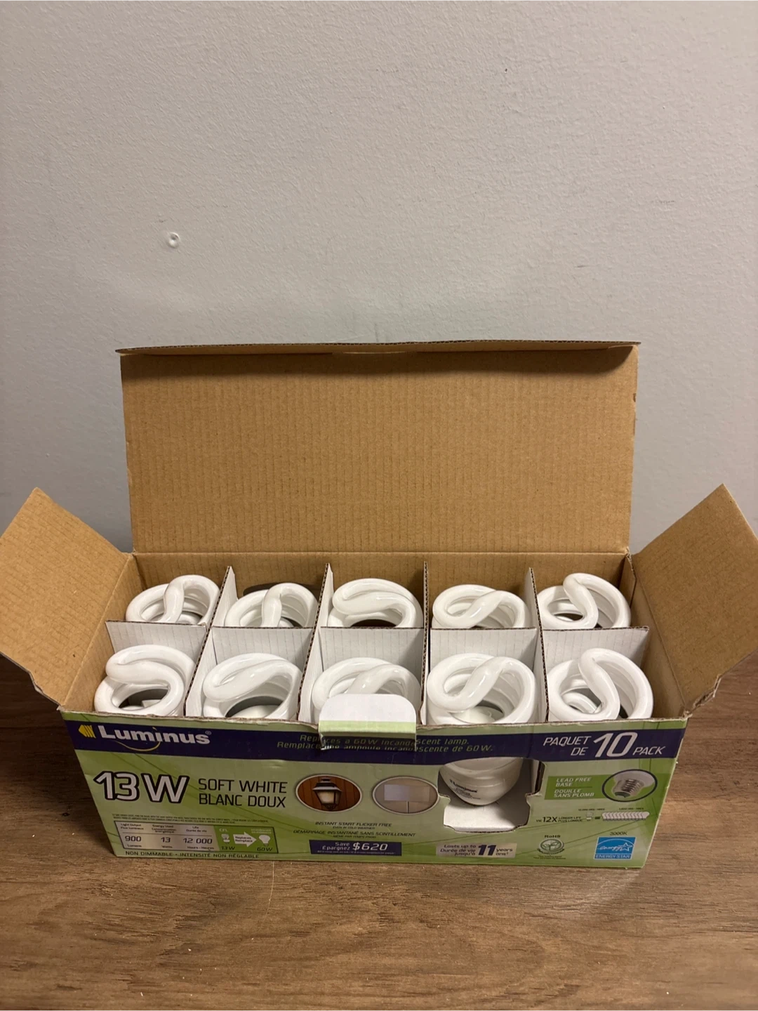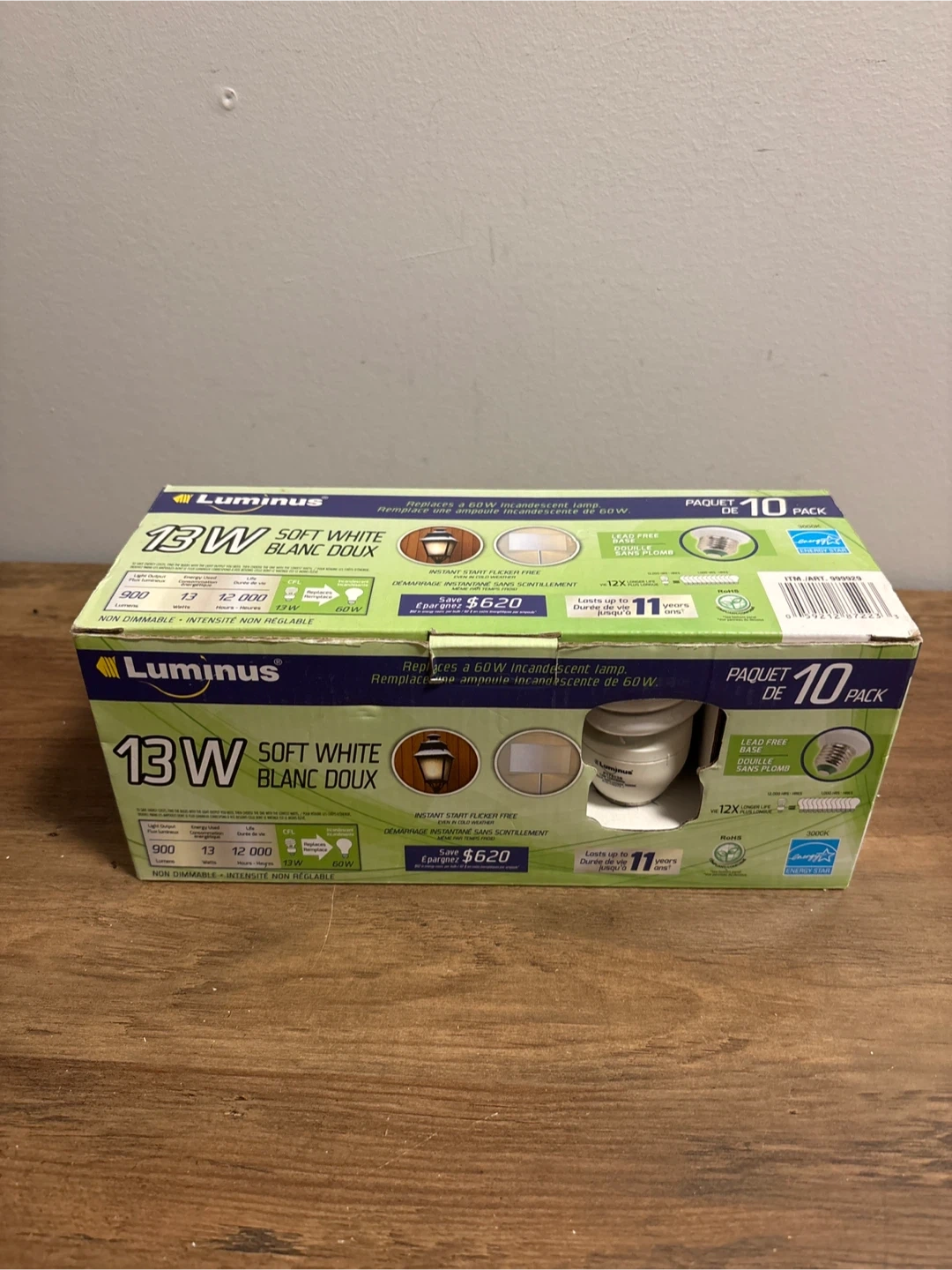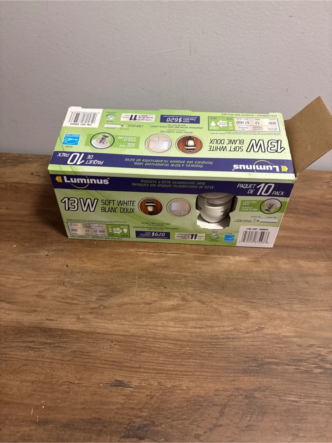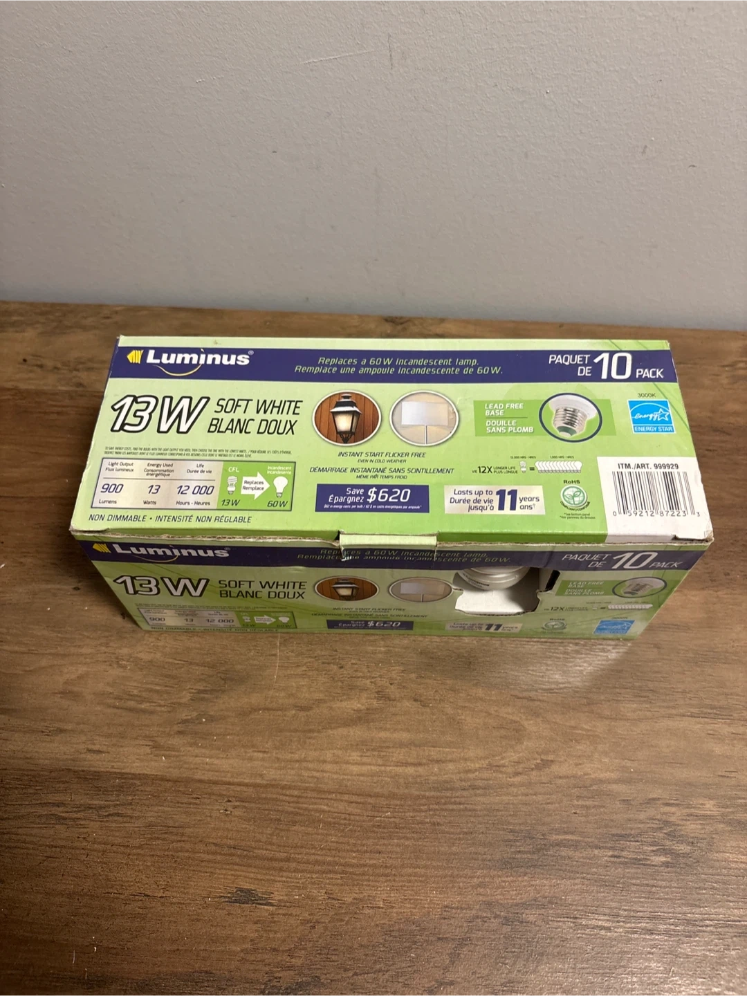 Selling a 10-pack of Luminus 13W soft white light bulbs. They replace a 60W incandescent lamp. These bulbs are lead-free and last up to 11 years. They are also instant start and flicker-free. Save up to $620 in energy costs per bulb!