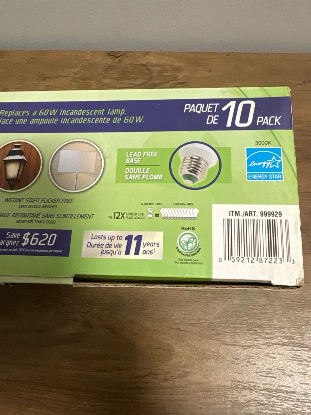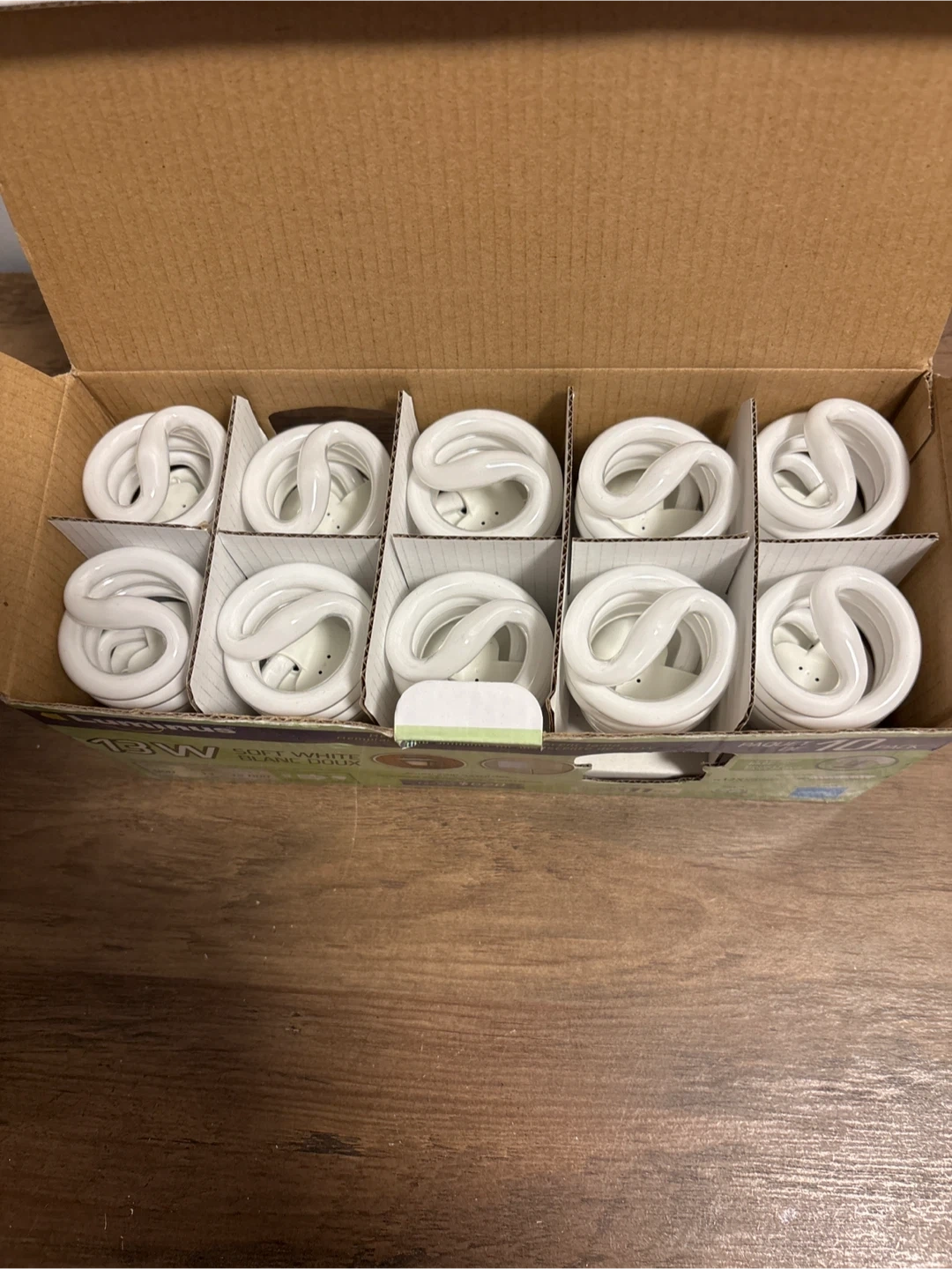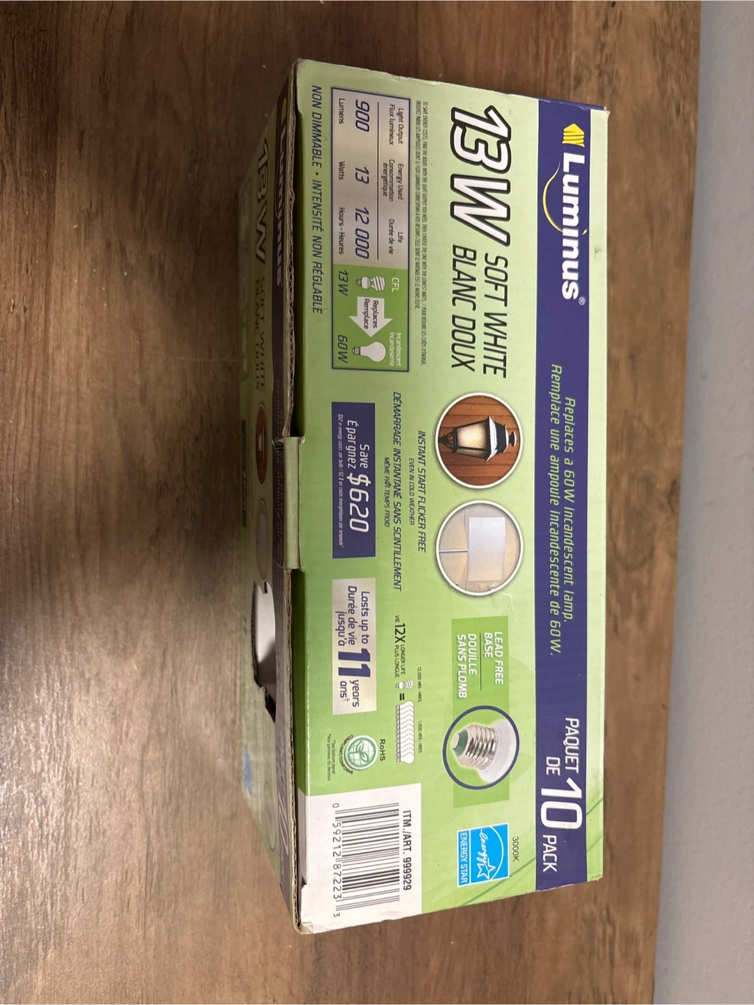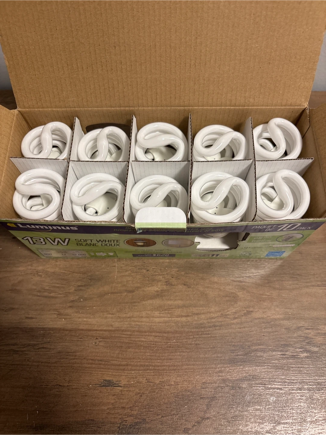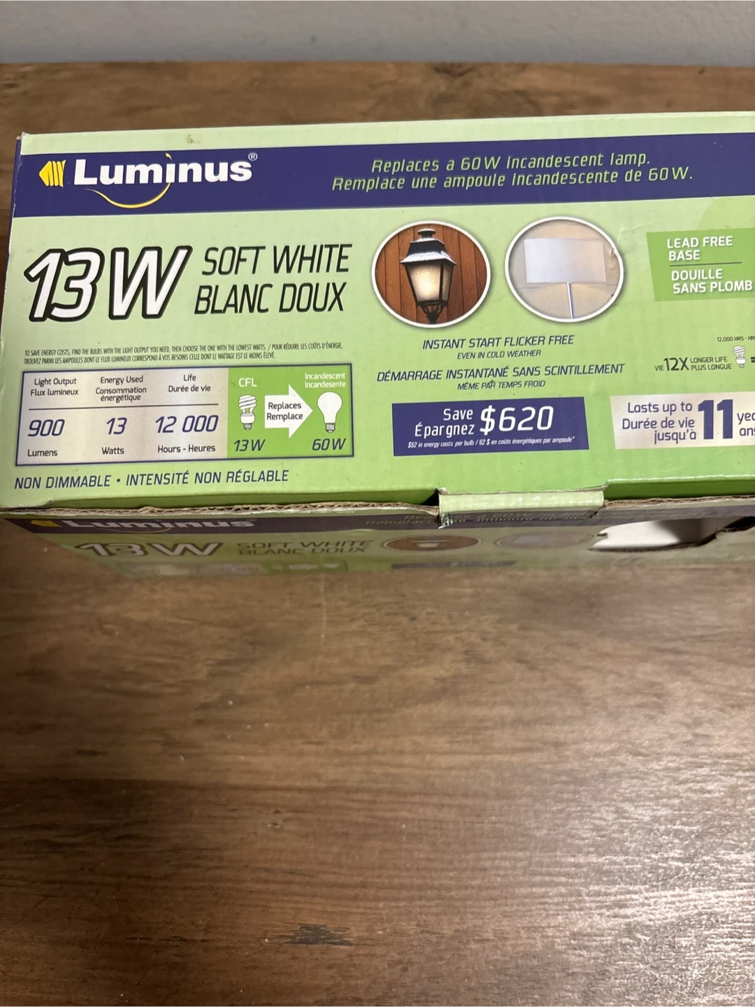 Selling a 10-pack of Luminus 13W soft white light bulbs. They replace a 60W incandescent lamp. These bulbs are lead-free and last up to 11 years. They are also instant start and flicker-free. Save up to $620 in energy costs per bulb!