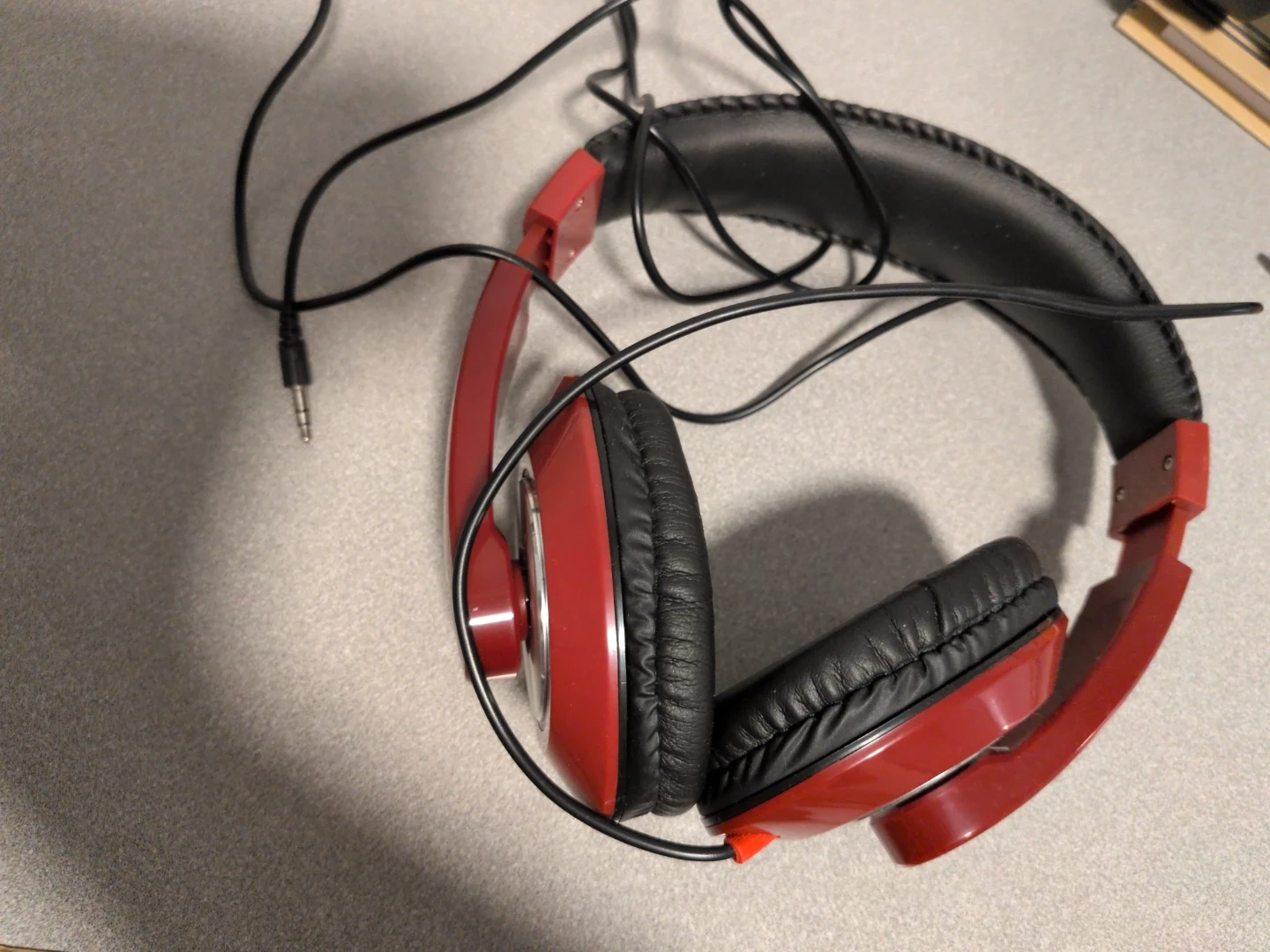 Selling a pair of wired headphones! They feature a red and black colour scheme, and have a comfortable padded headband and earcups. Perfect for listening to music, podcasts, or audiobooks.