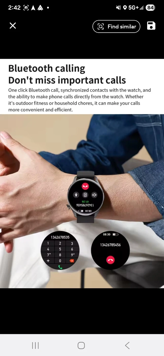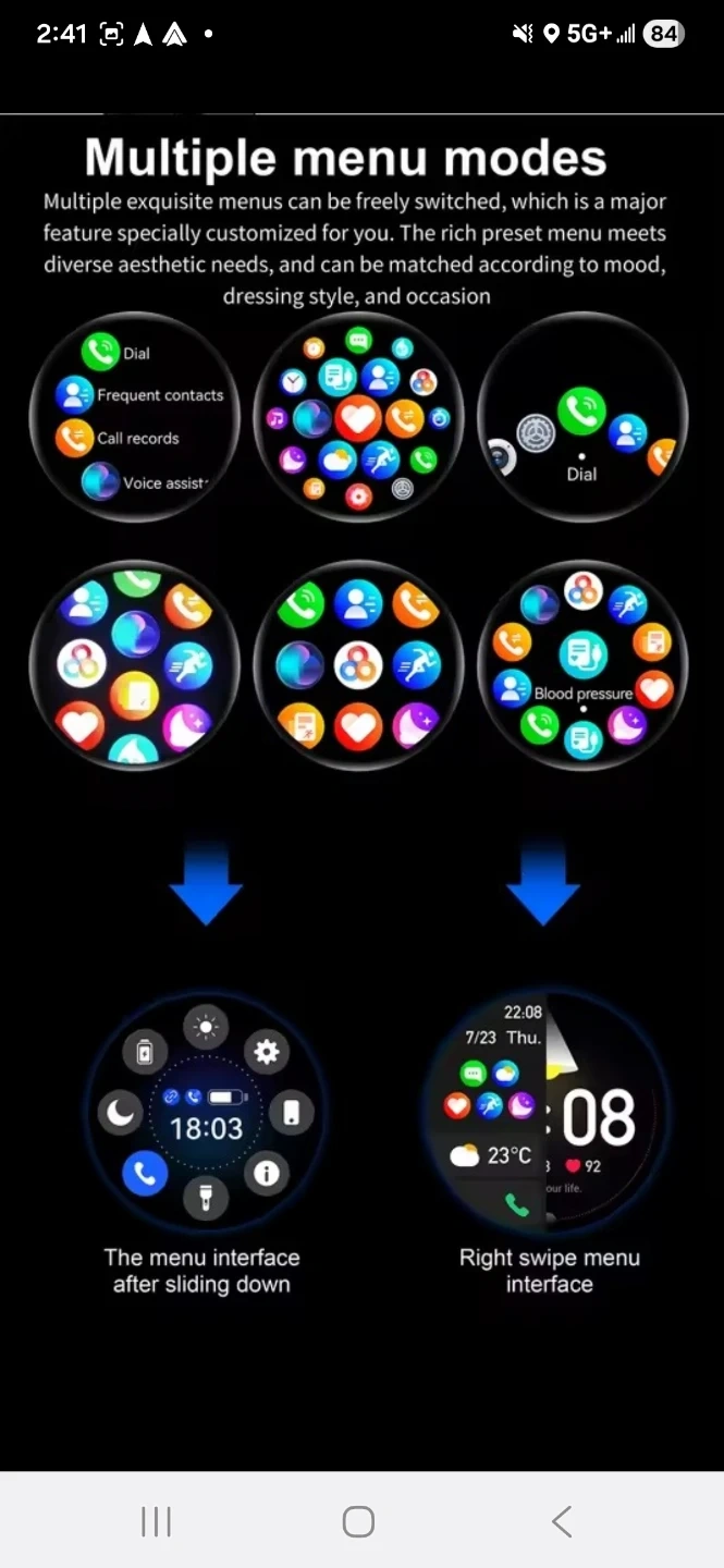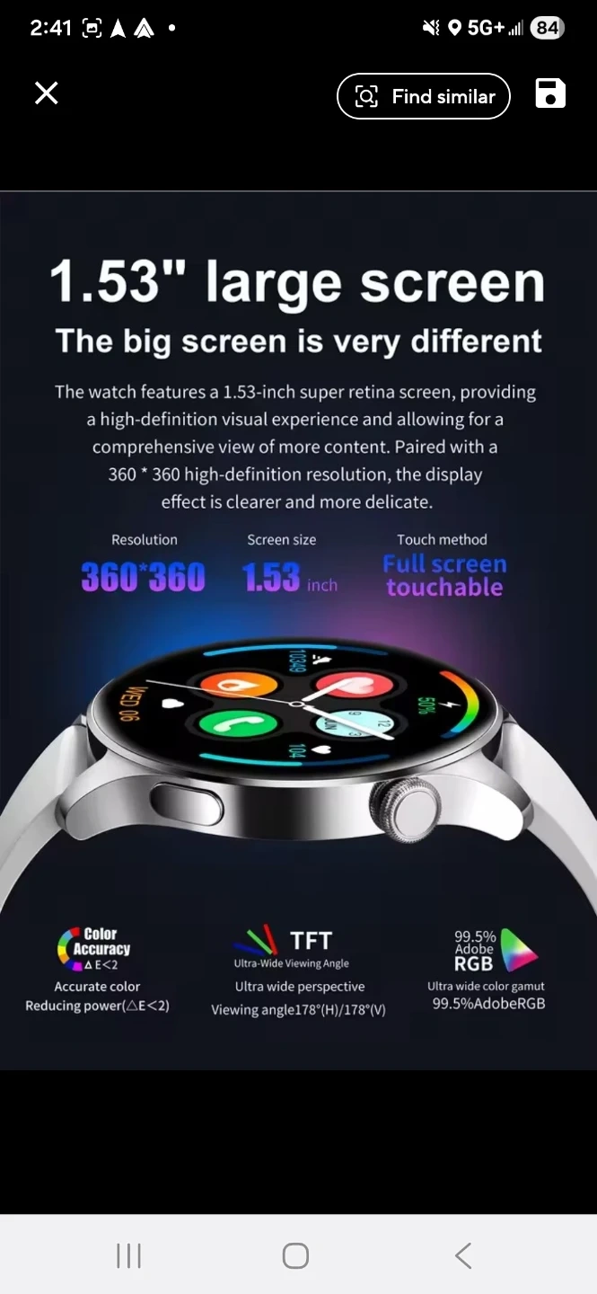 This smart watch is an intelligent companion on the wrist! It features a 1.53" high-definition large screen and Bluetooth calling. It also has health monitoring and multiple sports modes. The watch has a 360*360 resolution and a full screen touchable touch method. It also has multiple menu styles and a rotating button easy control interface