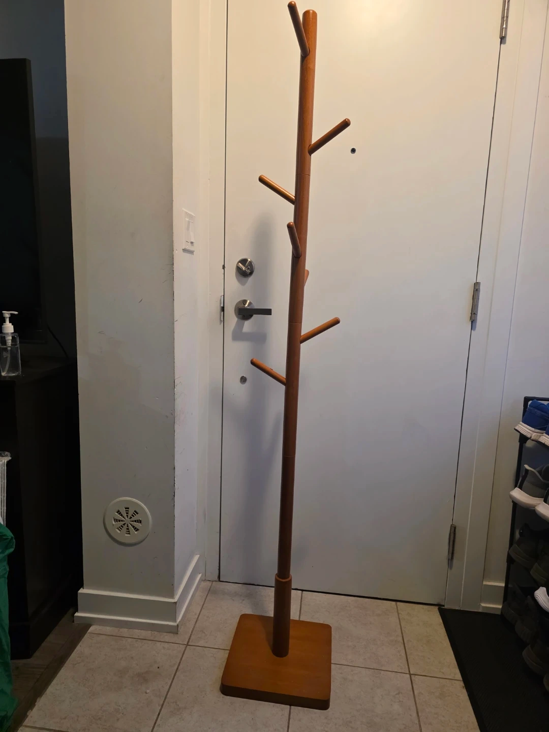 Here's a wooden coat rack stand! It's perfect for keeping your coats and hats organized. It has a sturdy base and a simple, clean design that would look great in any entryway or hallway