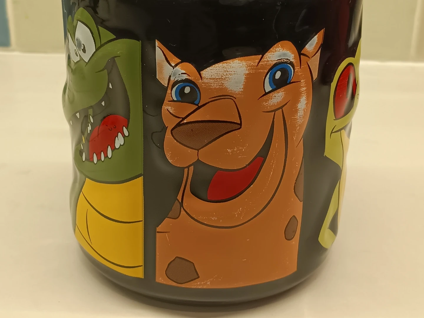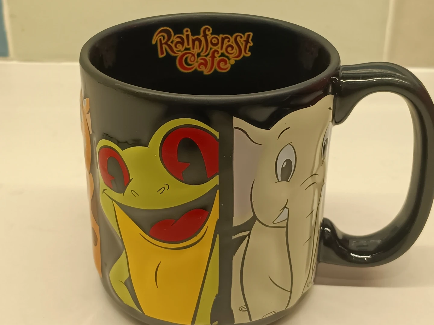 Here's a fun Rainforest Cafe mug! It features a bunch of cool animals like a frog, elephant, Scooby Doo, gorilla, and an alligator