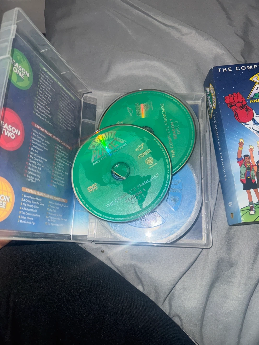 Selling a DVD set of Captain Planet and the Planeteers! It appears to be the complete franchise. The DVDs are in a clear plastic case that includes the disc list for each season