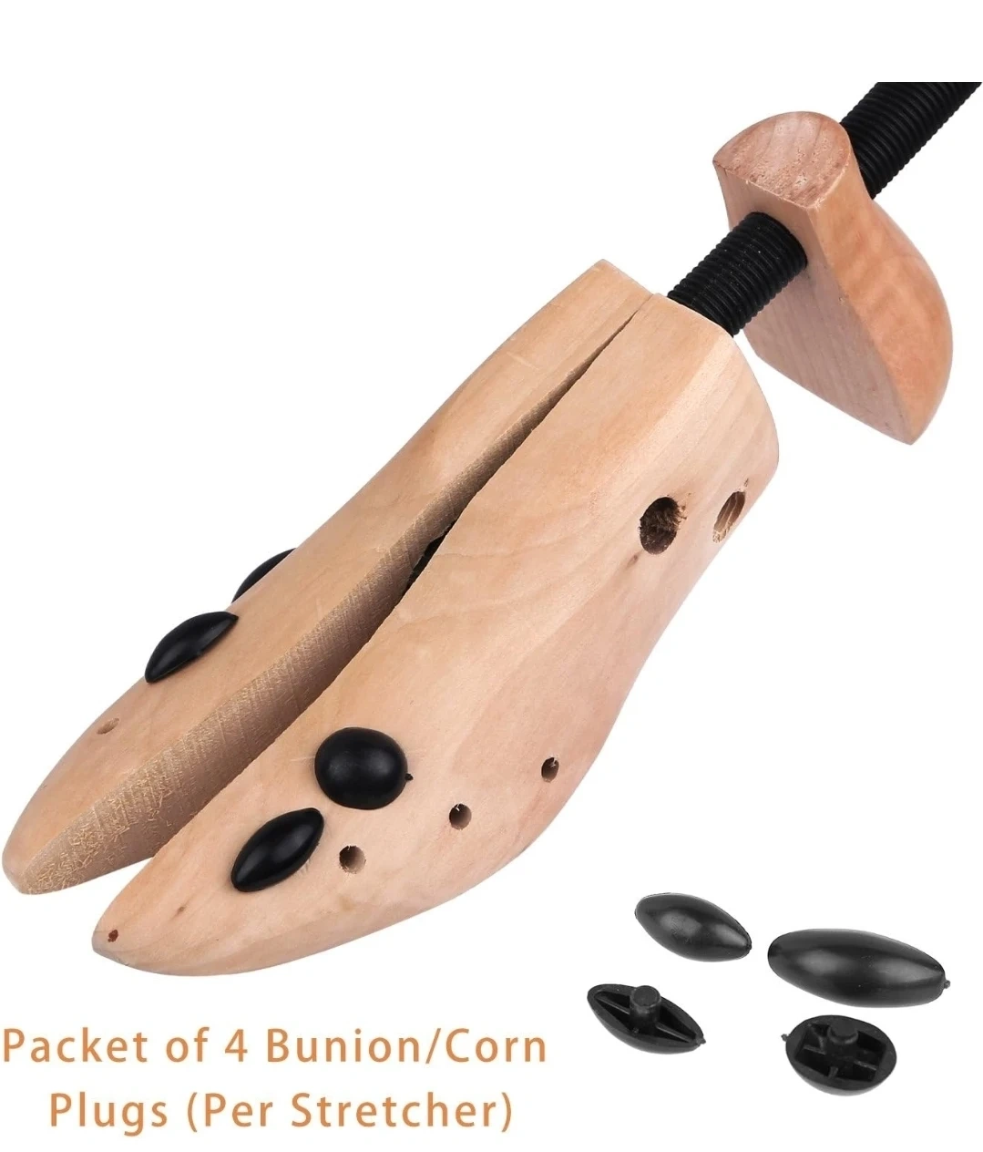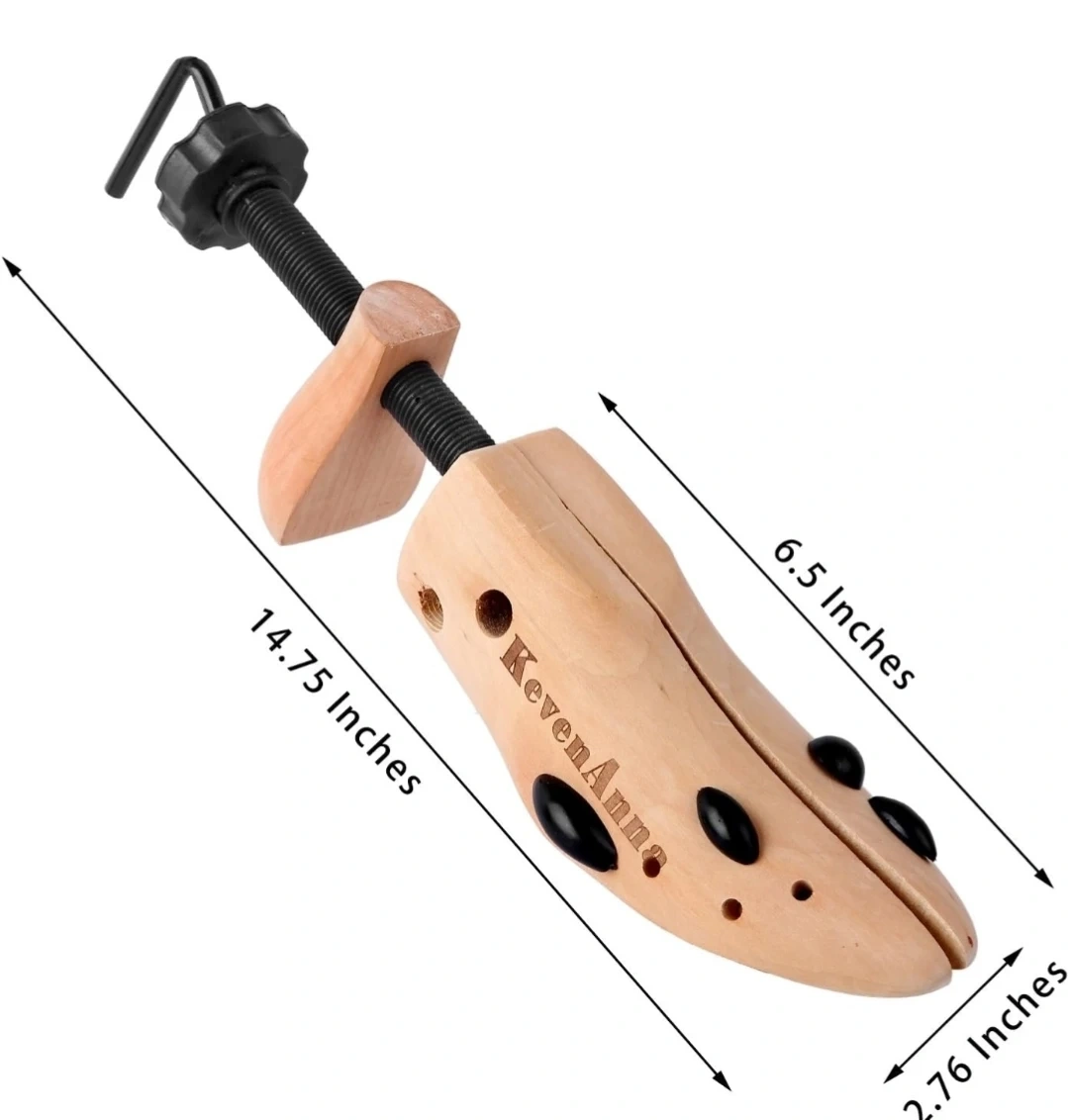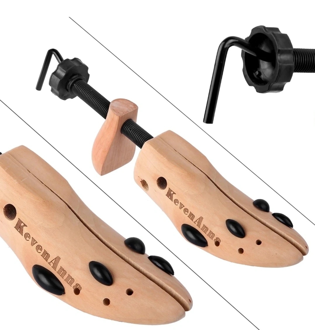 I'm selling a KevenAnna shoe stretcher. It's a medium size and made of wood. It also comes with a packet of 4 bunion/corn plugs per stretcher.