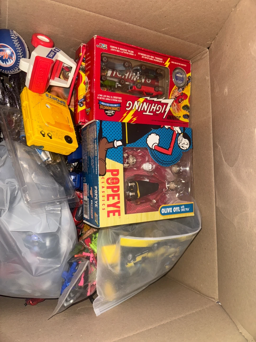 Selling a mixed lot of collectibles! Includes a Johnny Lightning commemorative die-cast car set and a Popeye Classics figure with Olive Oyl and Swee'Pea. Also has a yellow sports player and a baseball.