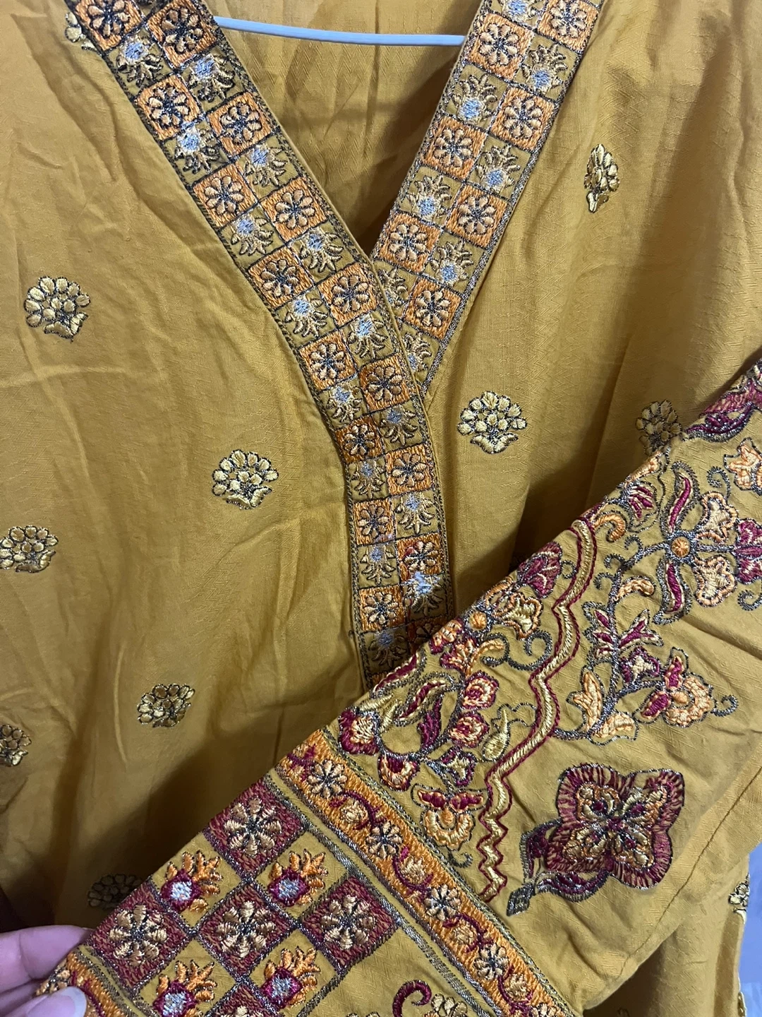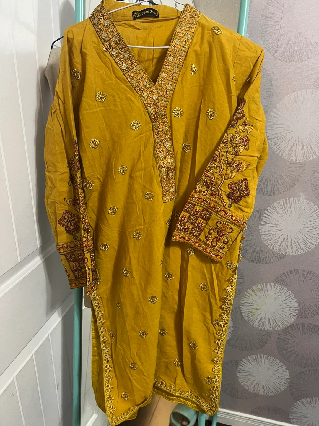 Selling a beautiful mustard yellow kurti with intricate embroidery, paired with beige pants. The kurti features detailed embroidery on the neckline and sleeves. Perfect for a special occasion or everyday wear!