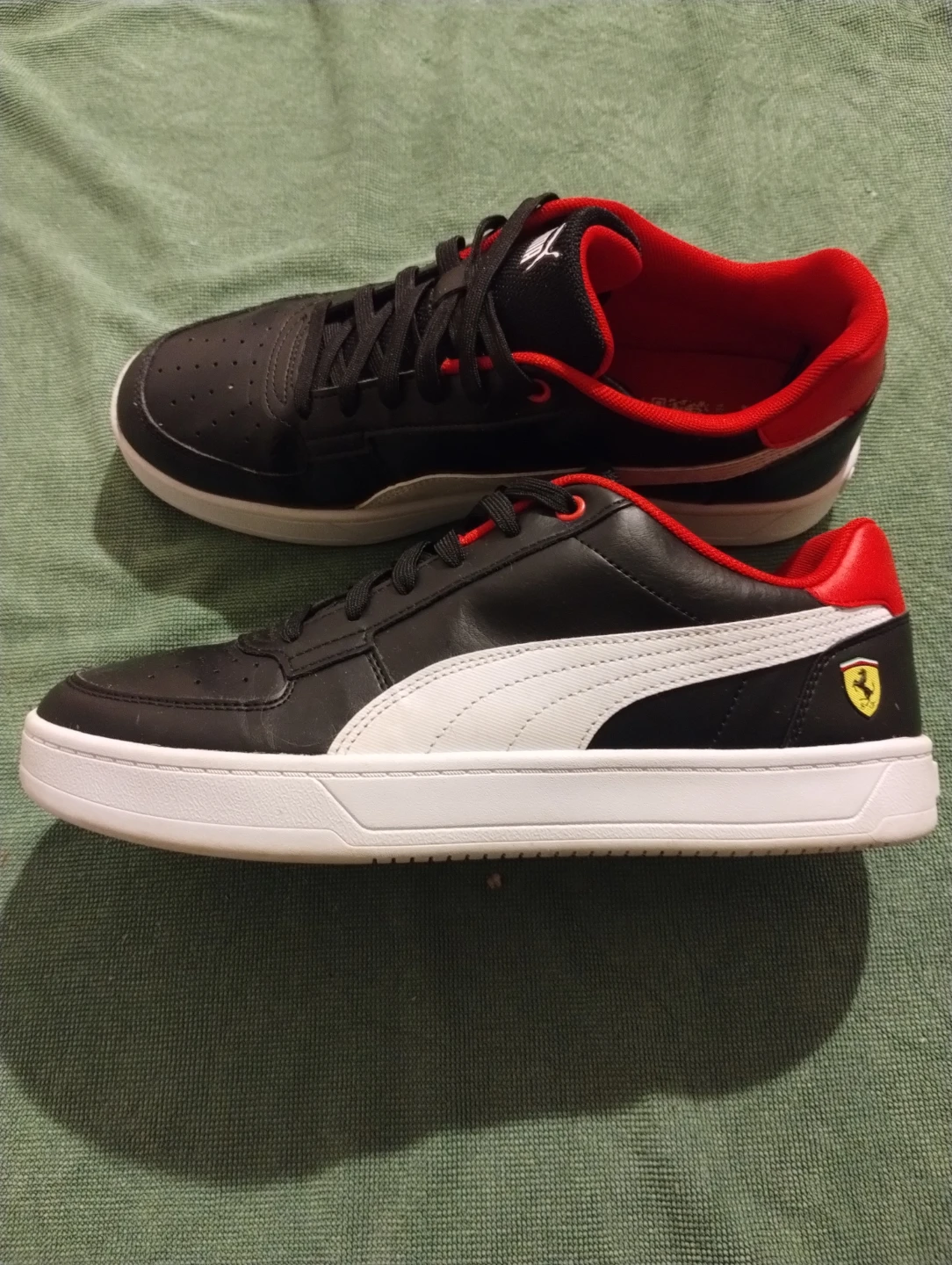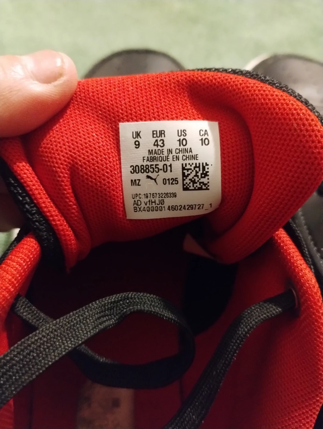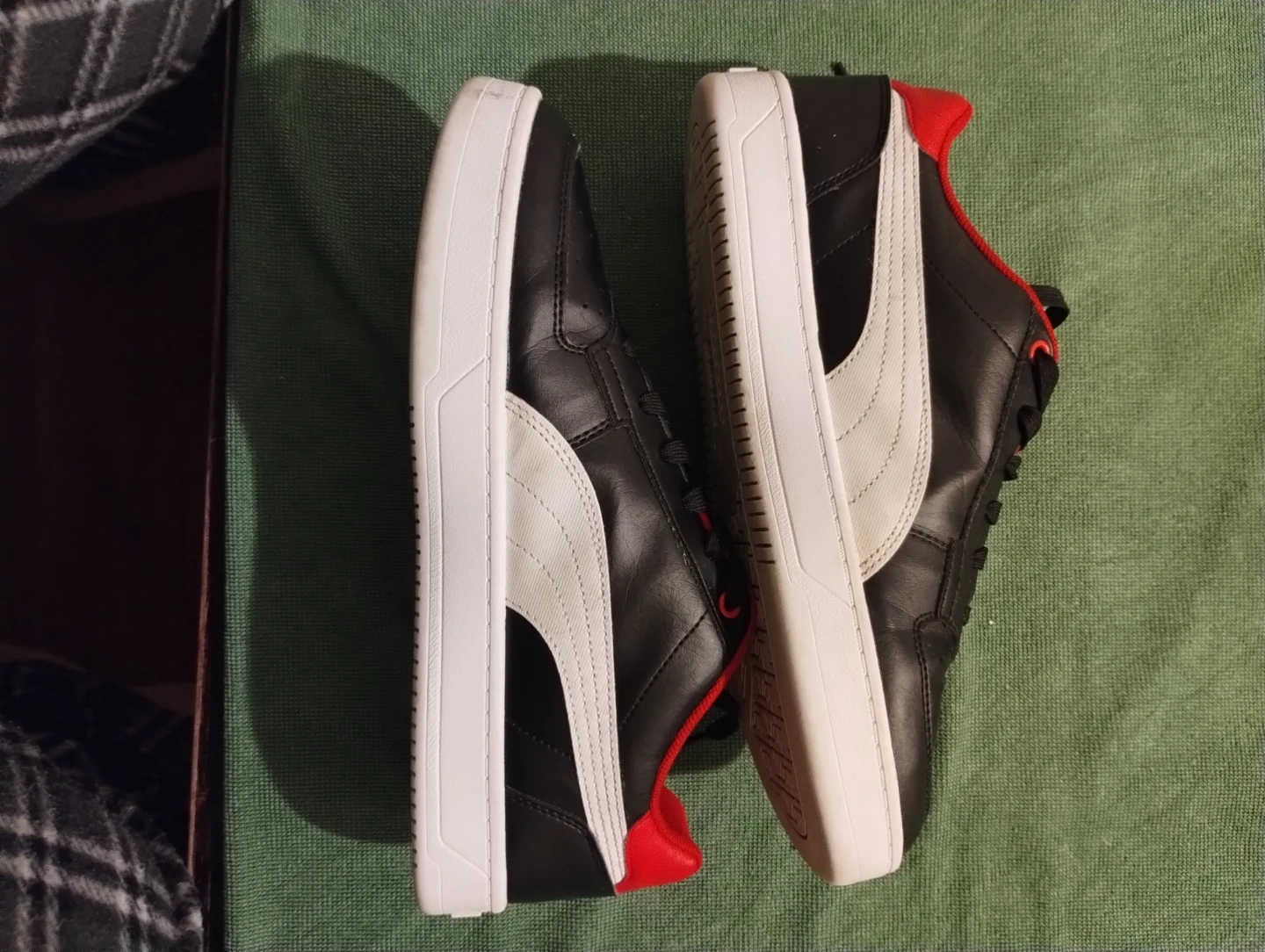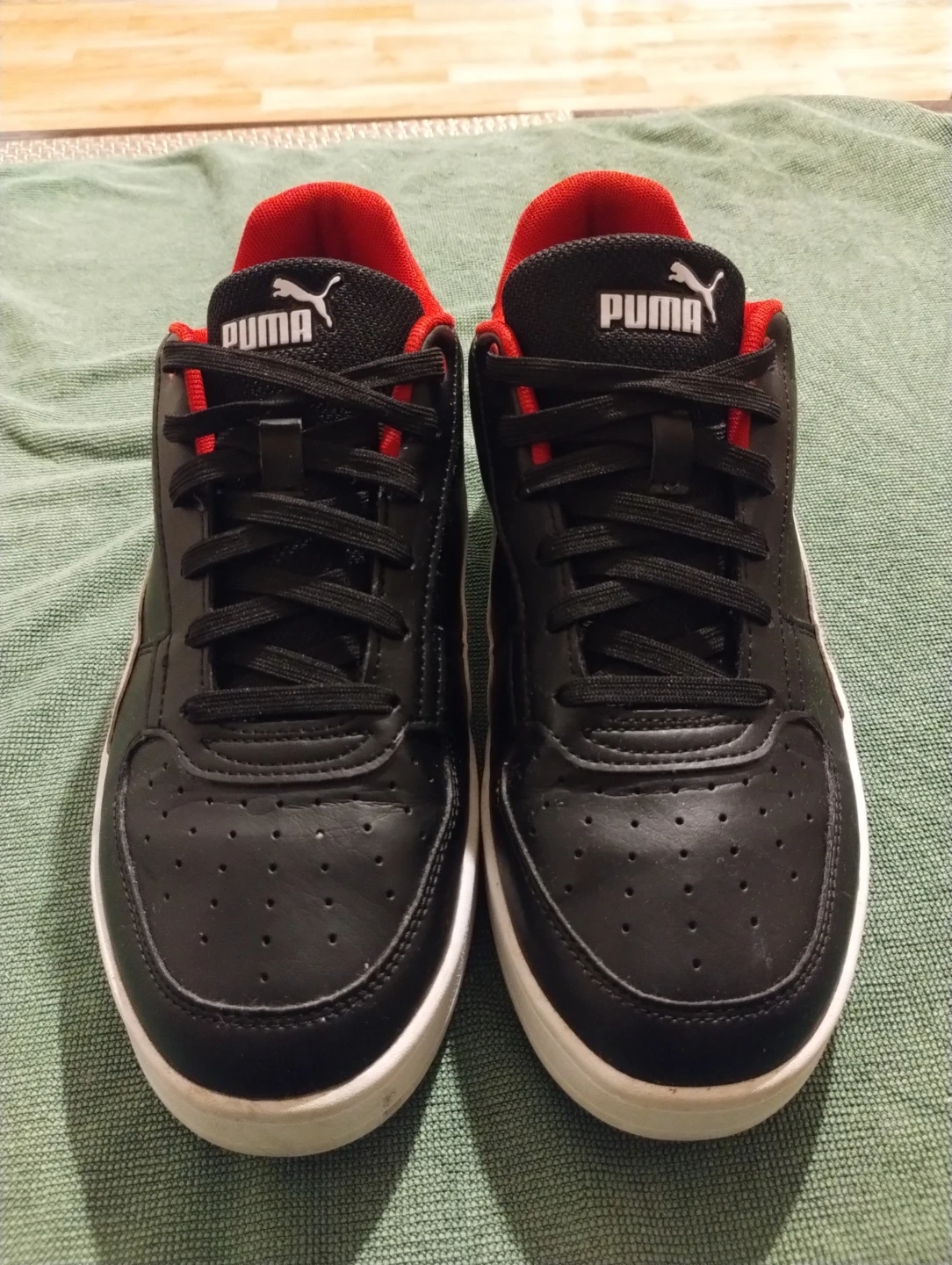 size US 10 . These stylish shoes feature a sleek black design with red and white accents. They are in great condition and ready for a new owner. PU Mimico and lakeshore