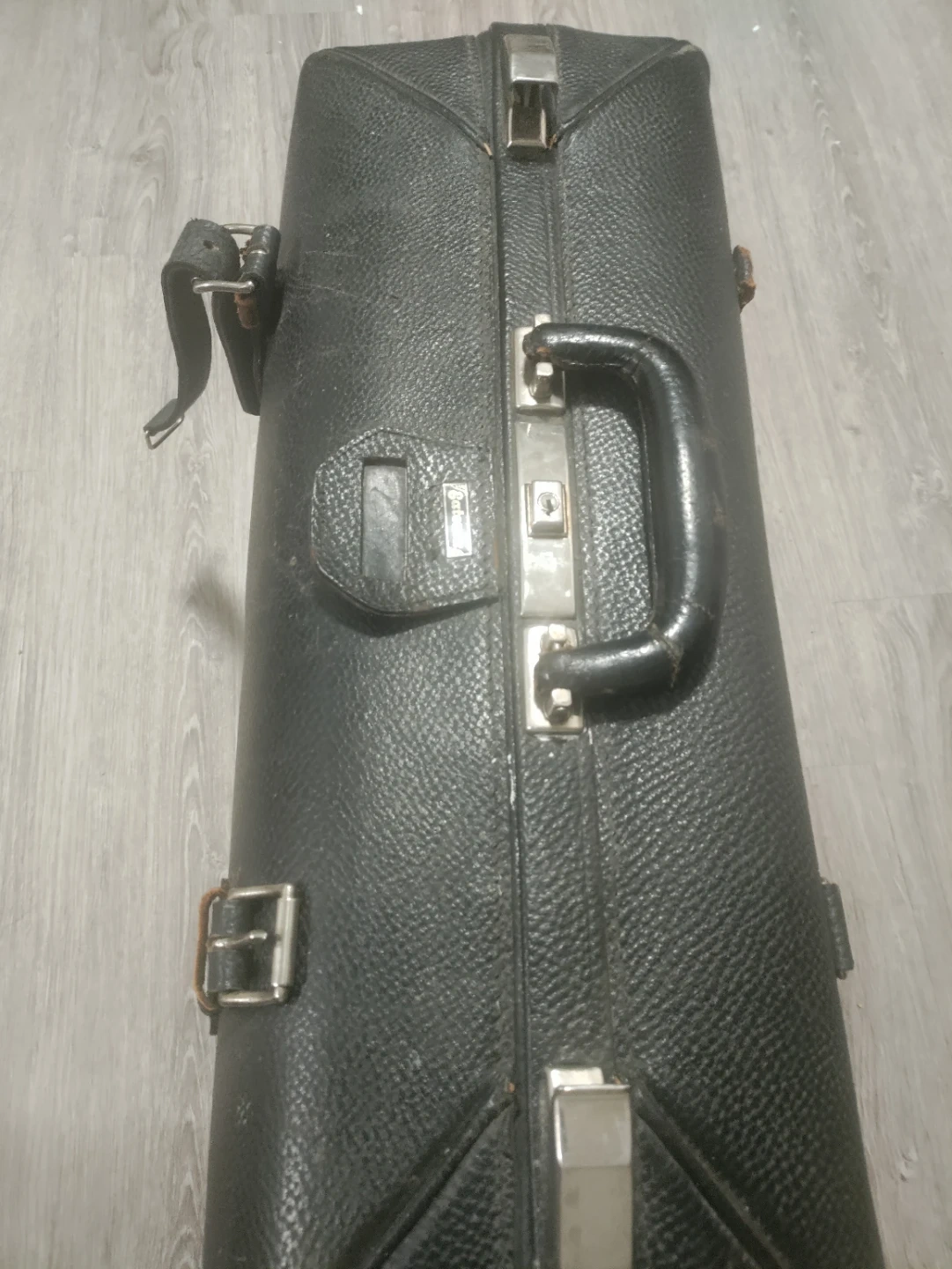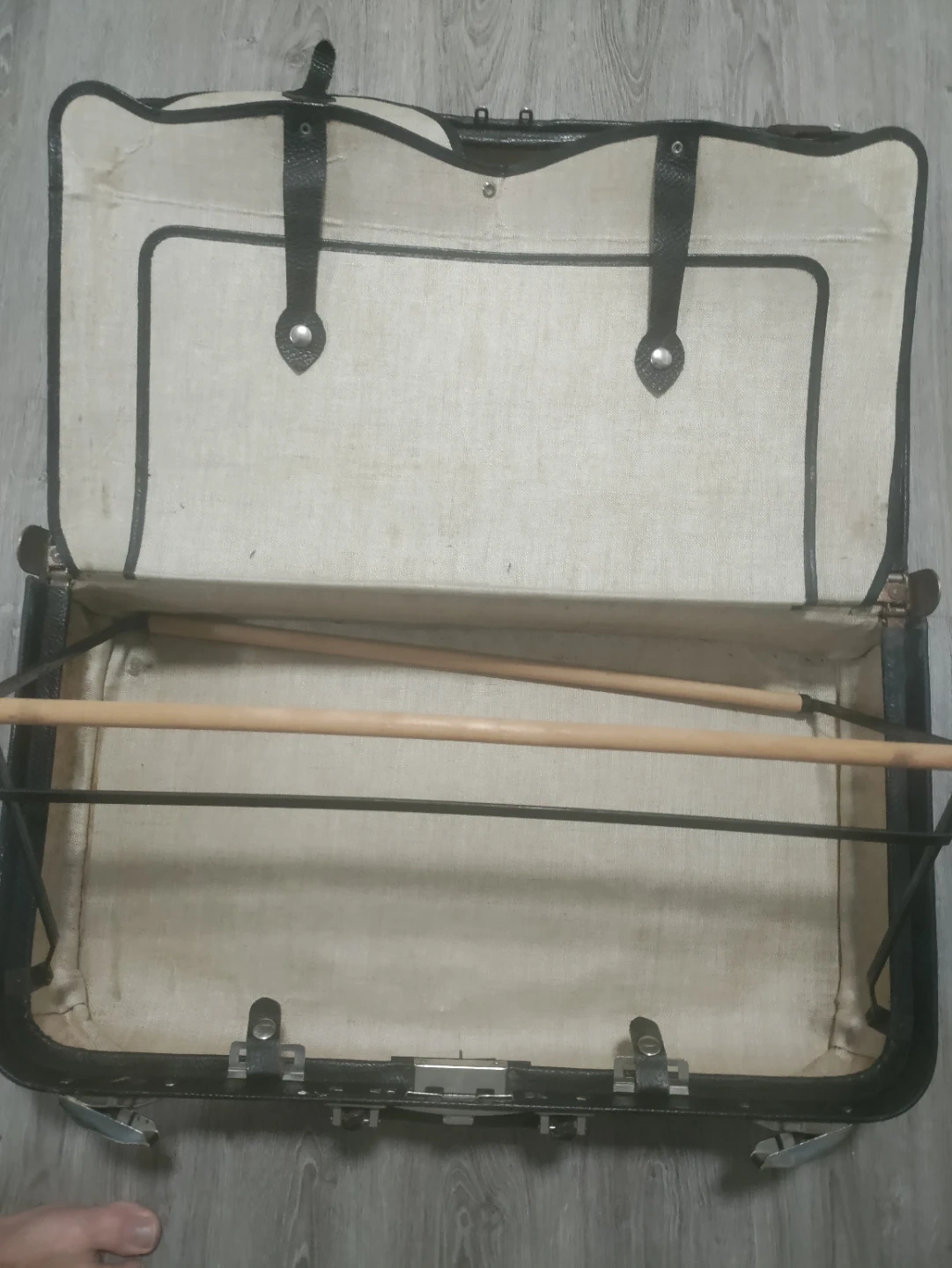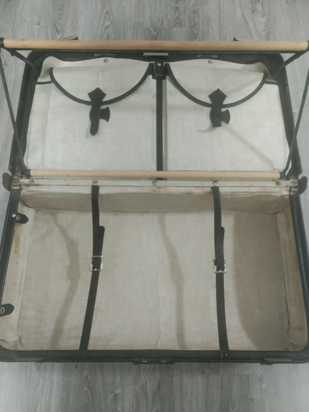Selling a vintage black Gatonia suitcase. It has a handle and clasps for closure. The interior has straps and wooden supports. There are some signs of wear, adding to its vintage charm