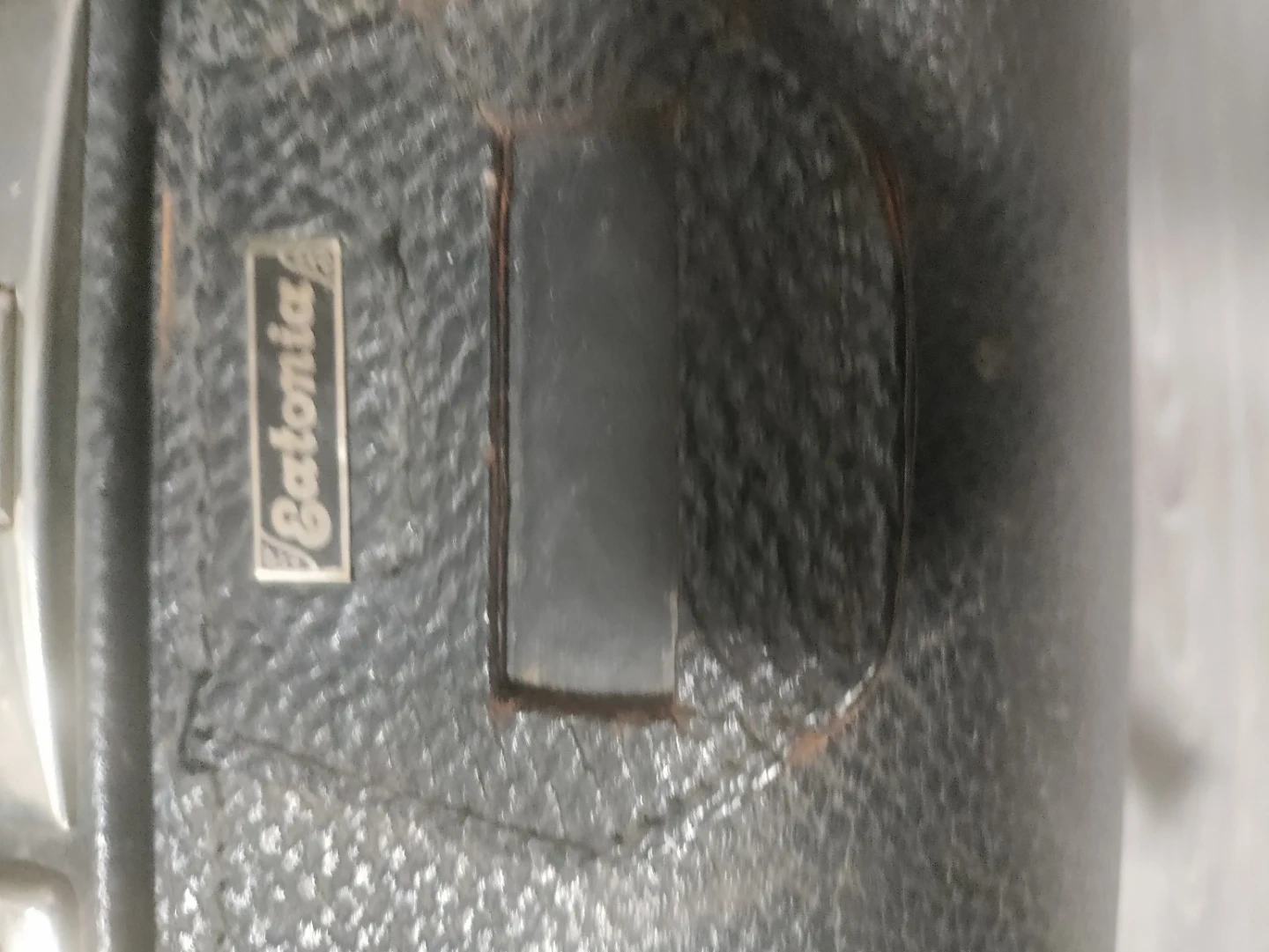 Selling a vintage black Gatonia suitcase. It has a handle and clasps for closure. The interior has straps and wooden supports. There are some signs of wear, adding to its vintage charm
