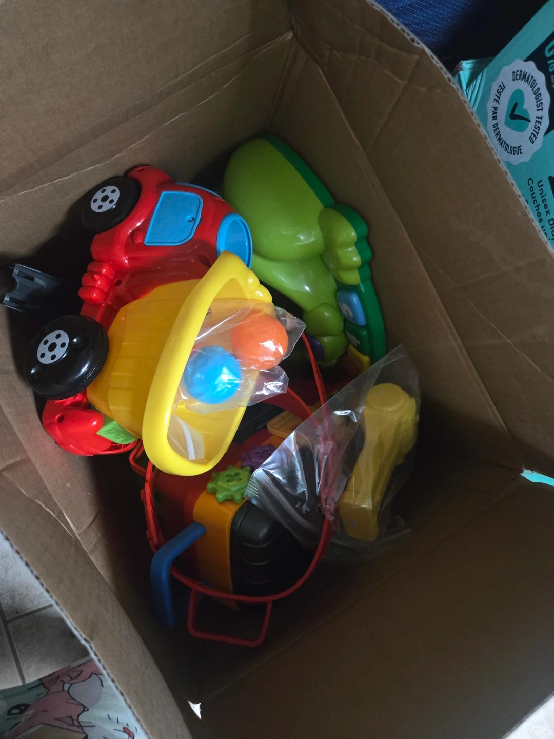 Selling a box of assorted kids toys! Includes a toy car, a green frog ball toy with, a tool kit with tools, and other fun items. Perfect for toddlers and young children to explore and play with