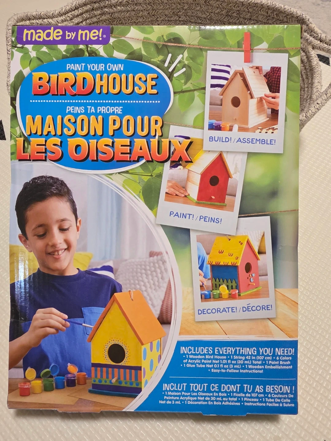 Get creative with this Made By Me! Paint Your Own Birdhouse kit! It includes everything you need to build and decorate your own birdhouse: a wooden birdhouse, strips of acrylic paint, a paint brush, a tube of glue, and easy-to-follow instructions! Fun and easy to assemble, making it a great activity for kids aged 6+