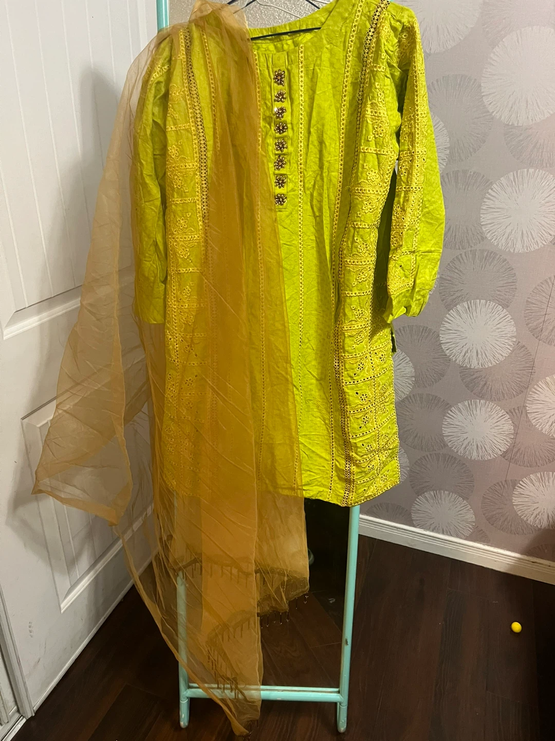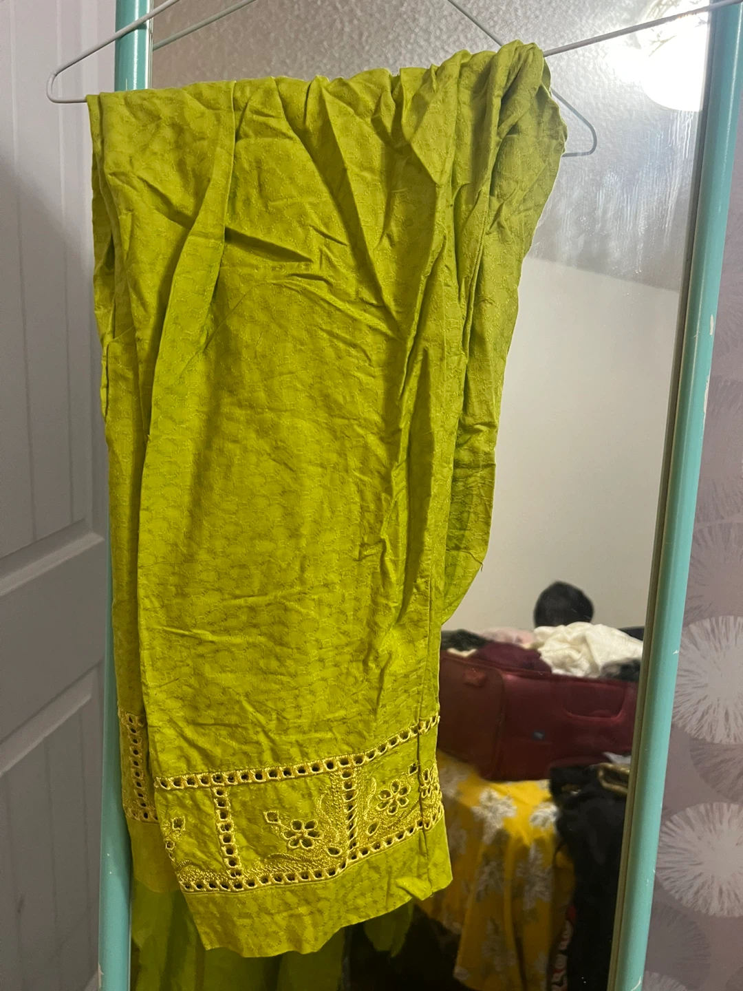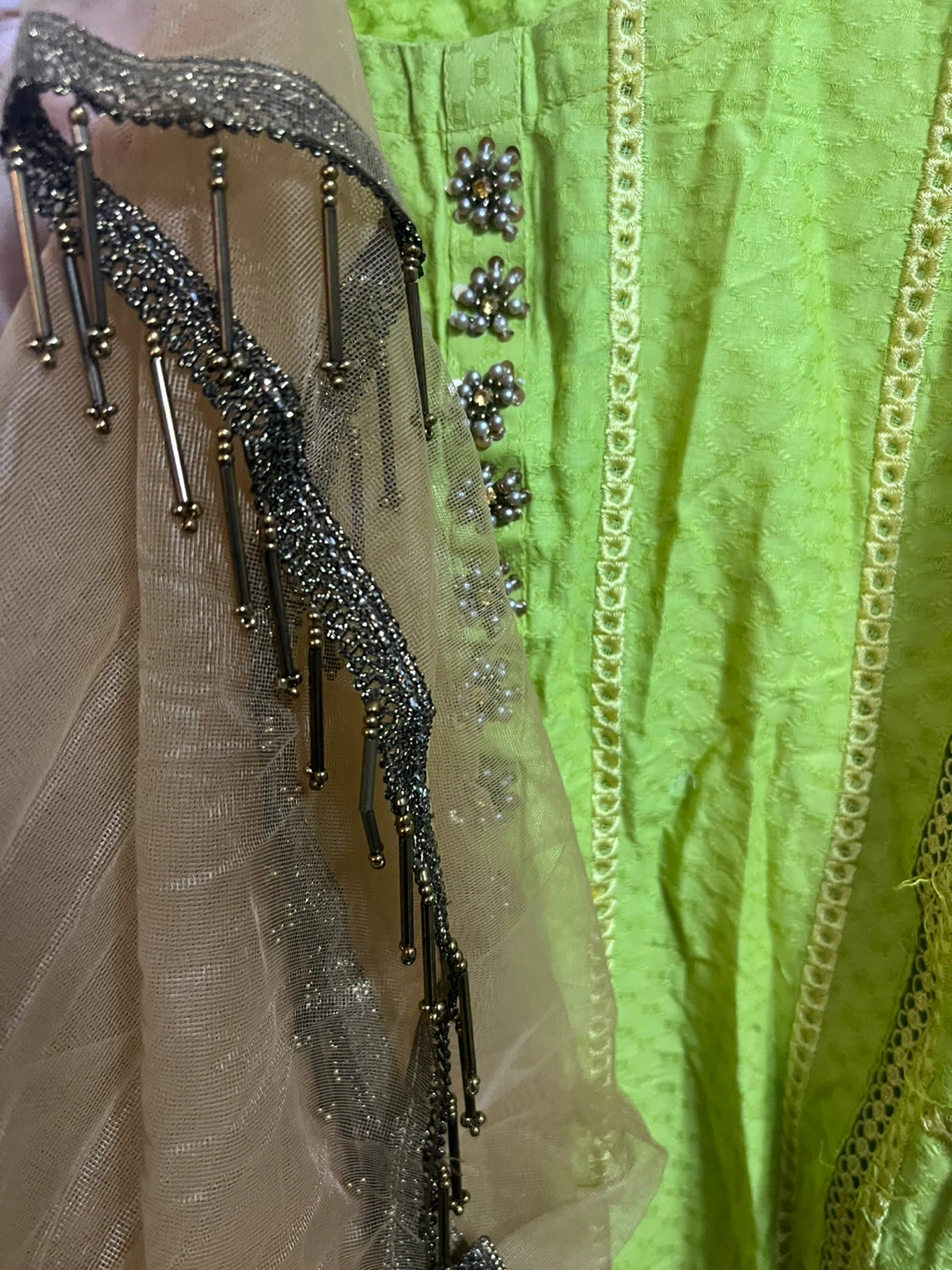 Selling a beautiful green shalwar kameez with intricate embroidery. It comes with a matching dupatta. Perfect for a special occasion or festive wear! The colour is a vibrant green.