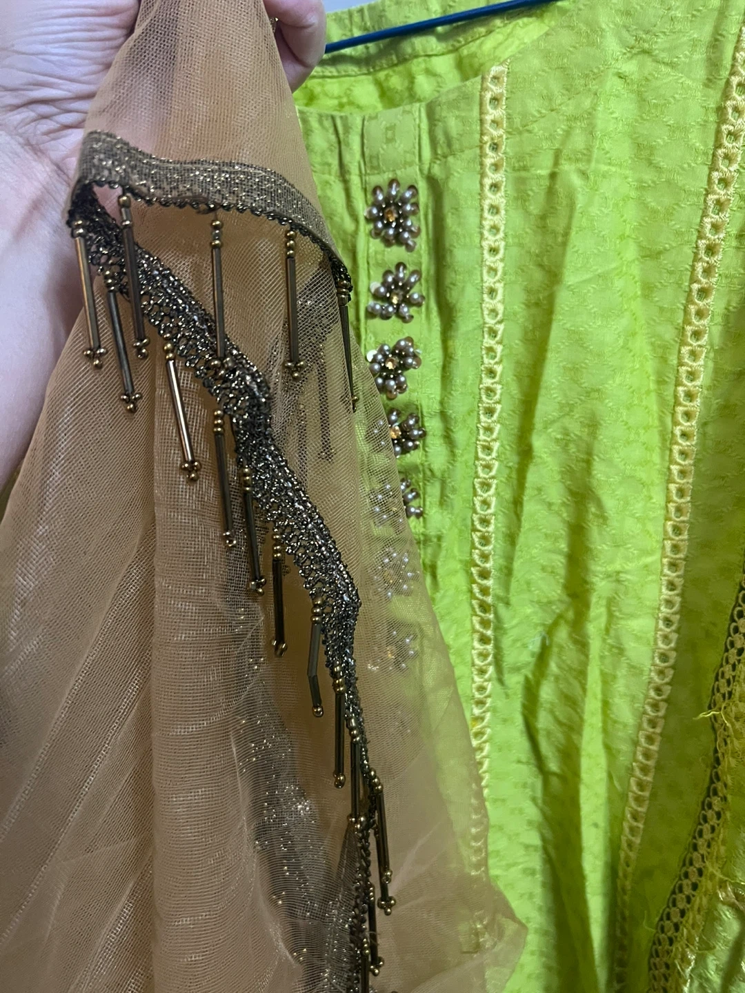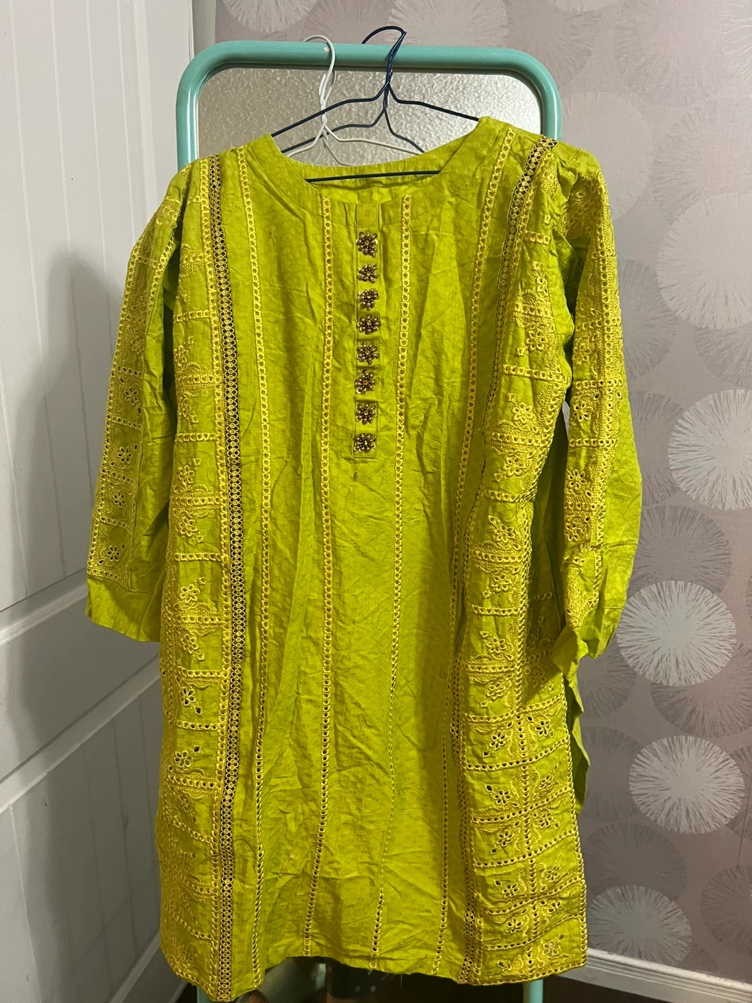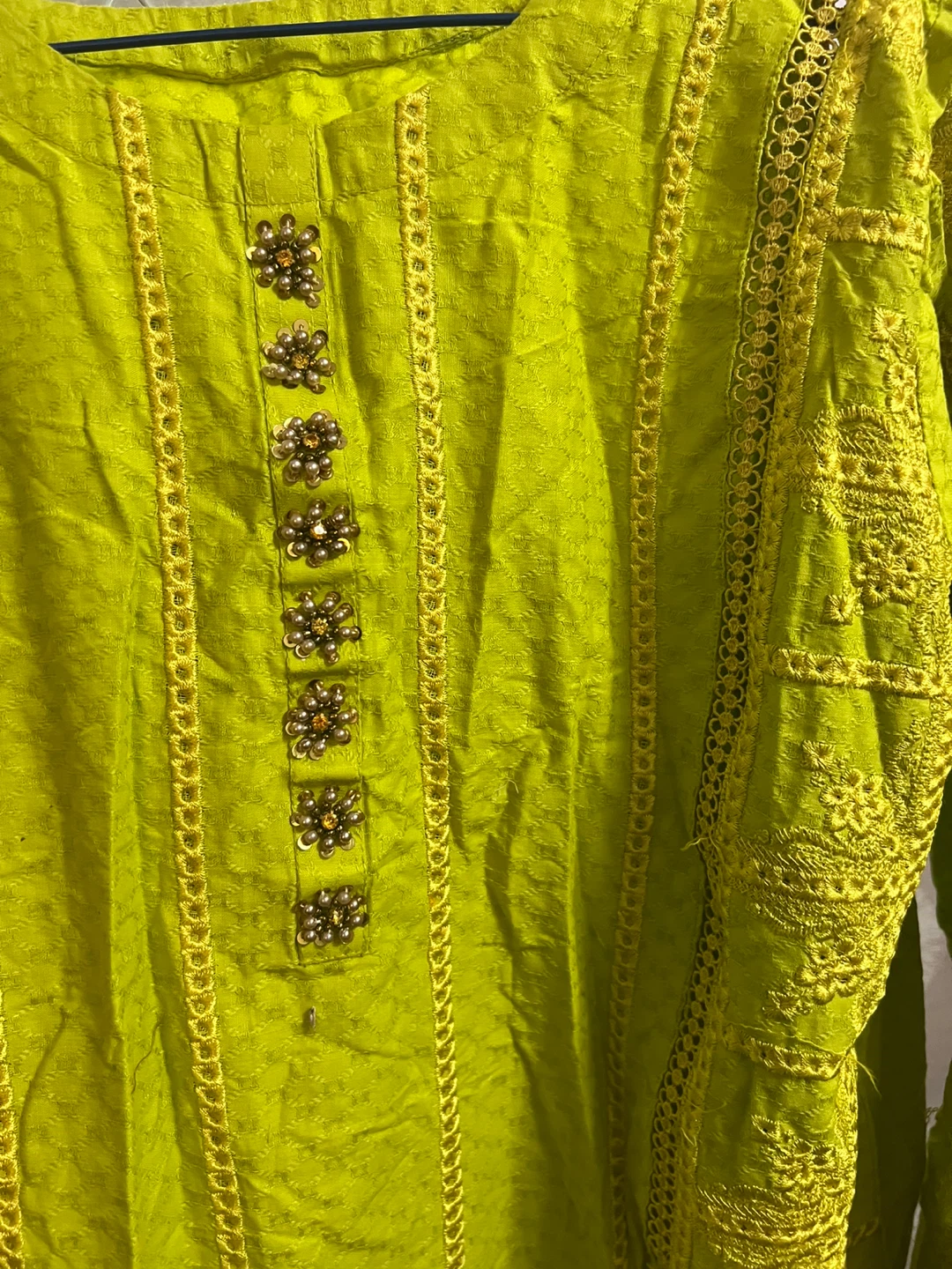 Selling a beautiful green shalwar kameez with intricate embroidery. It comes with a matching dupatta. Perfect for a special occasion or festive wear! The colour is a vibrant green.