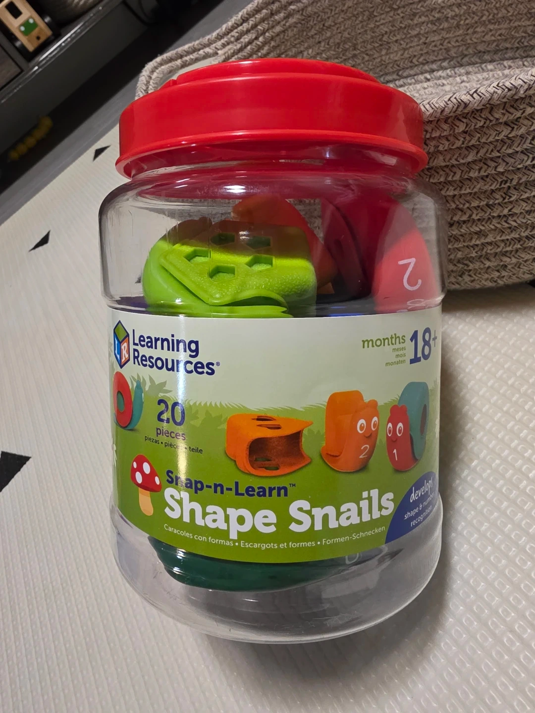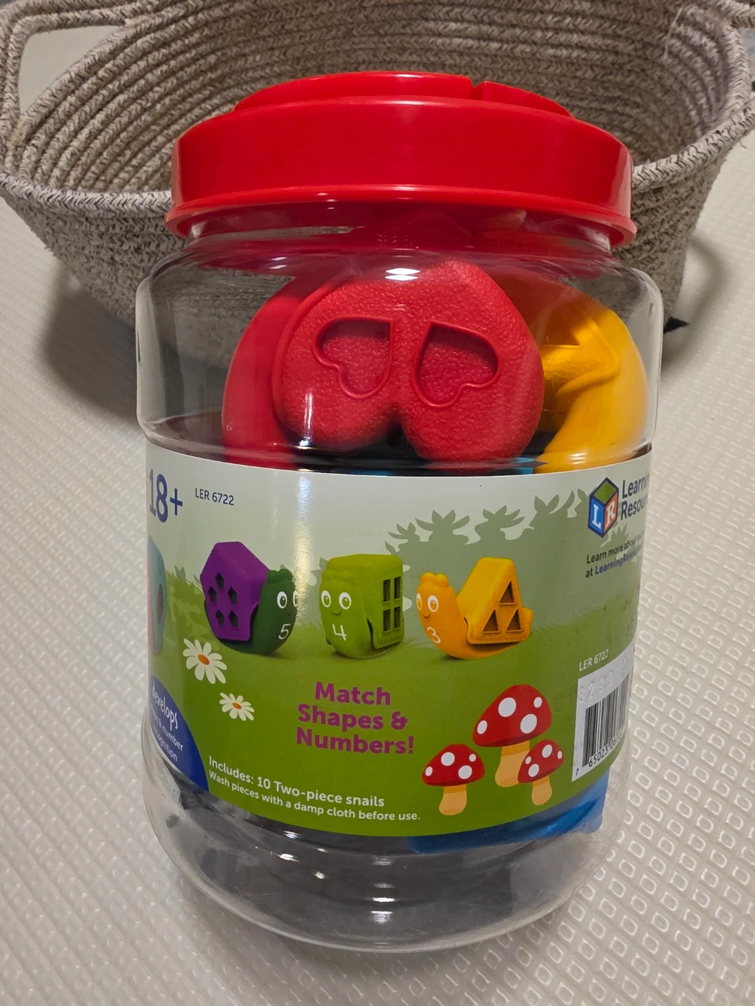 These Learning Resources Shape Snails are perfect for little ones aged 18 months and up! They help develop shape and number recognition. Includes 10 two-piece snails. Wash pieces with a damp cloth before use