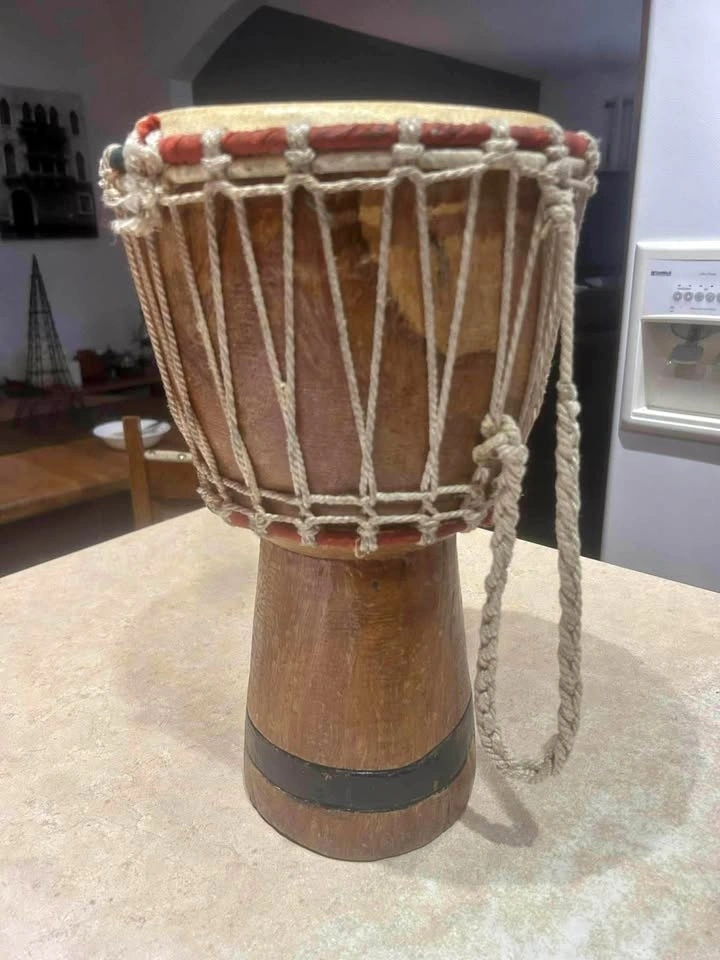 Authentic West African rope-tuned djembe with a carved hardwood body and natural skin head.
