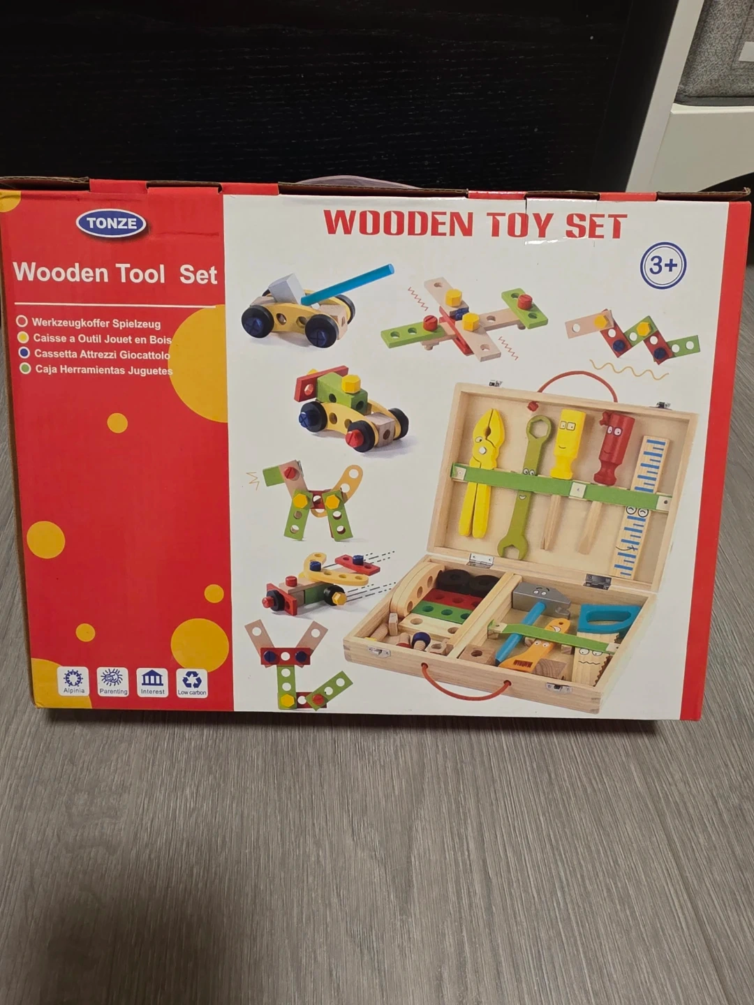 This is a Wooden Tool Set with 35 pieces! It's a great set for kids aged 3+ to explore and learn with wooden tools.